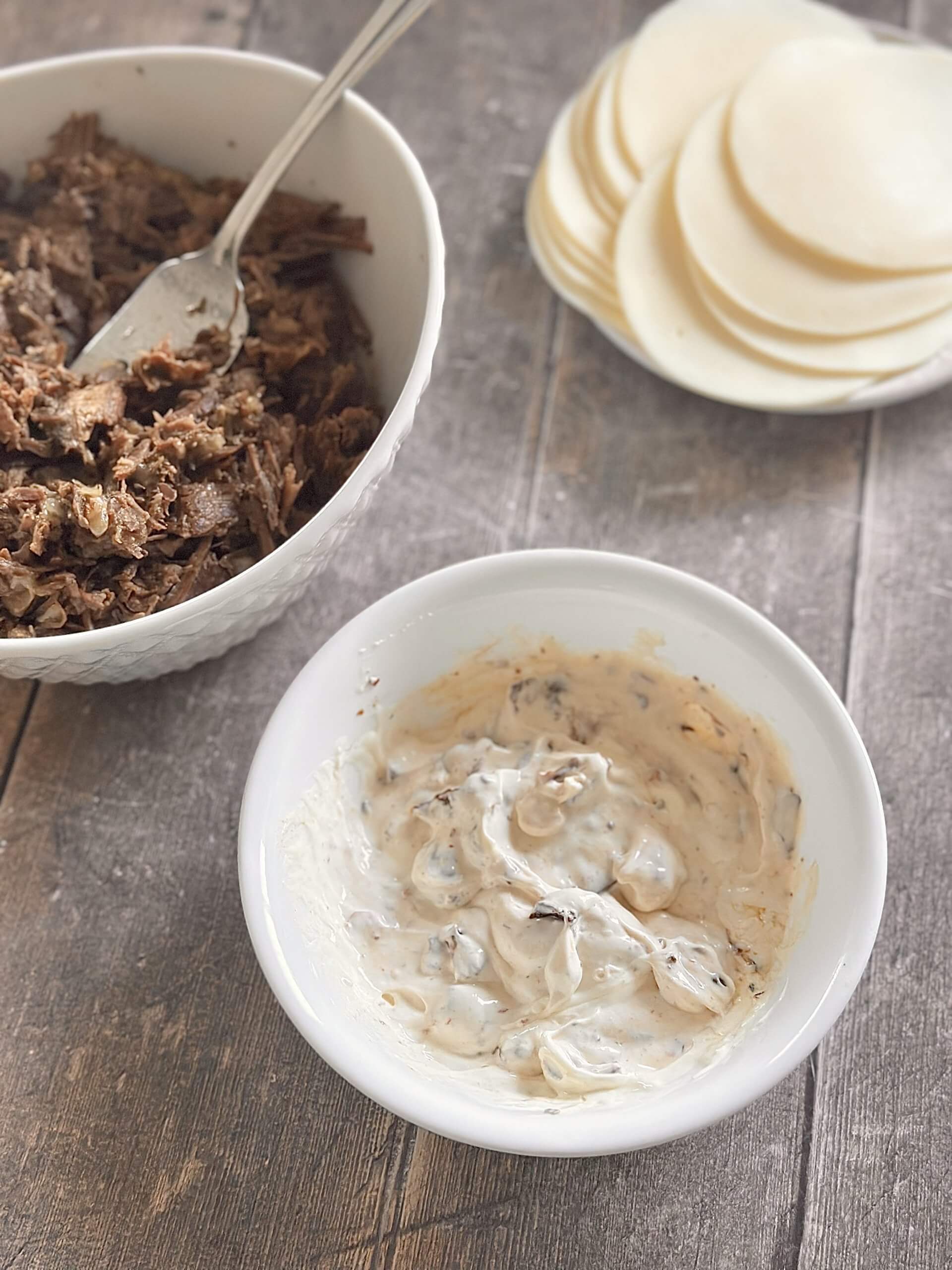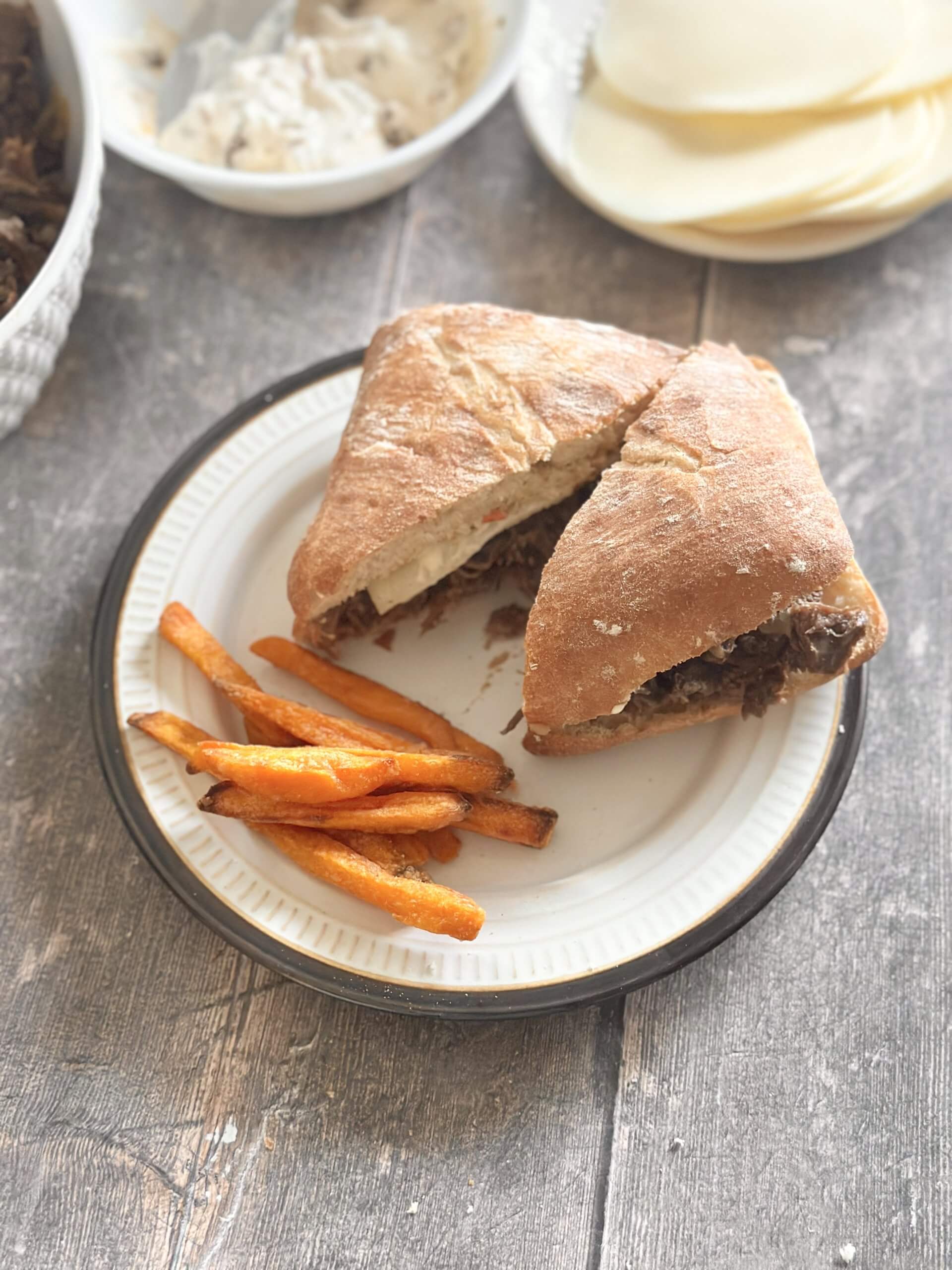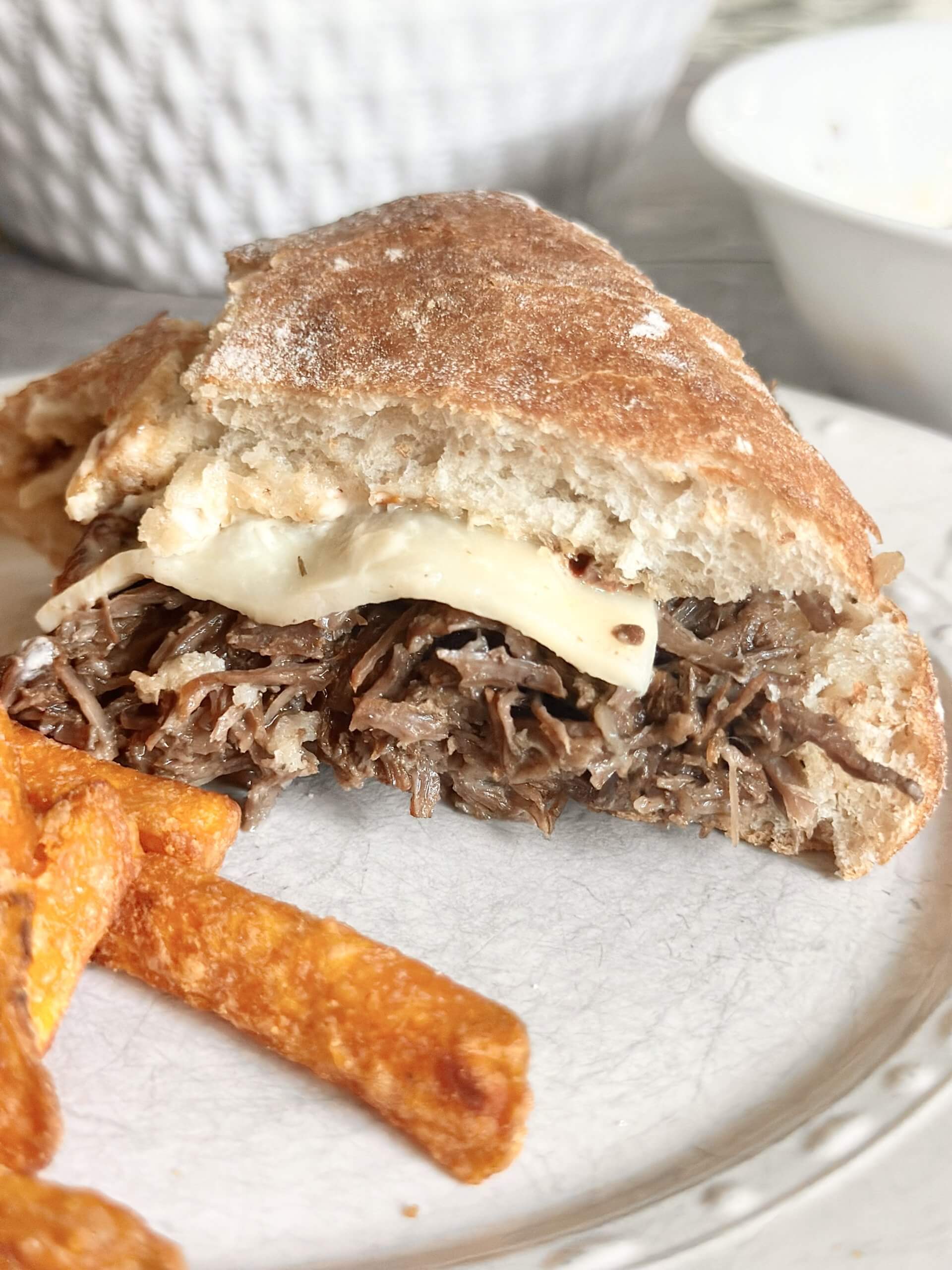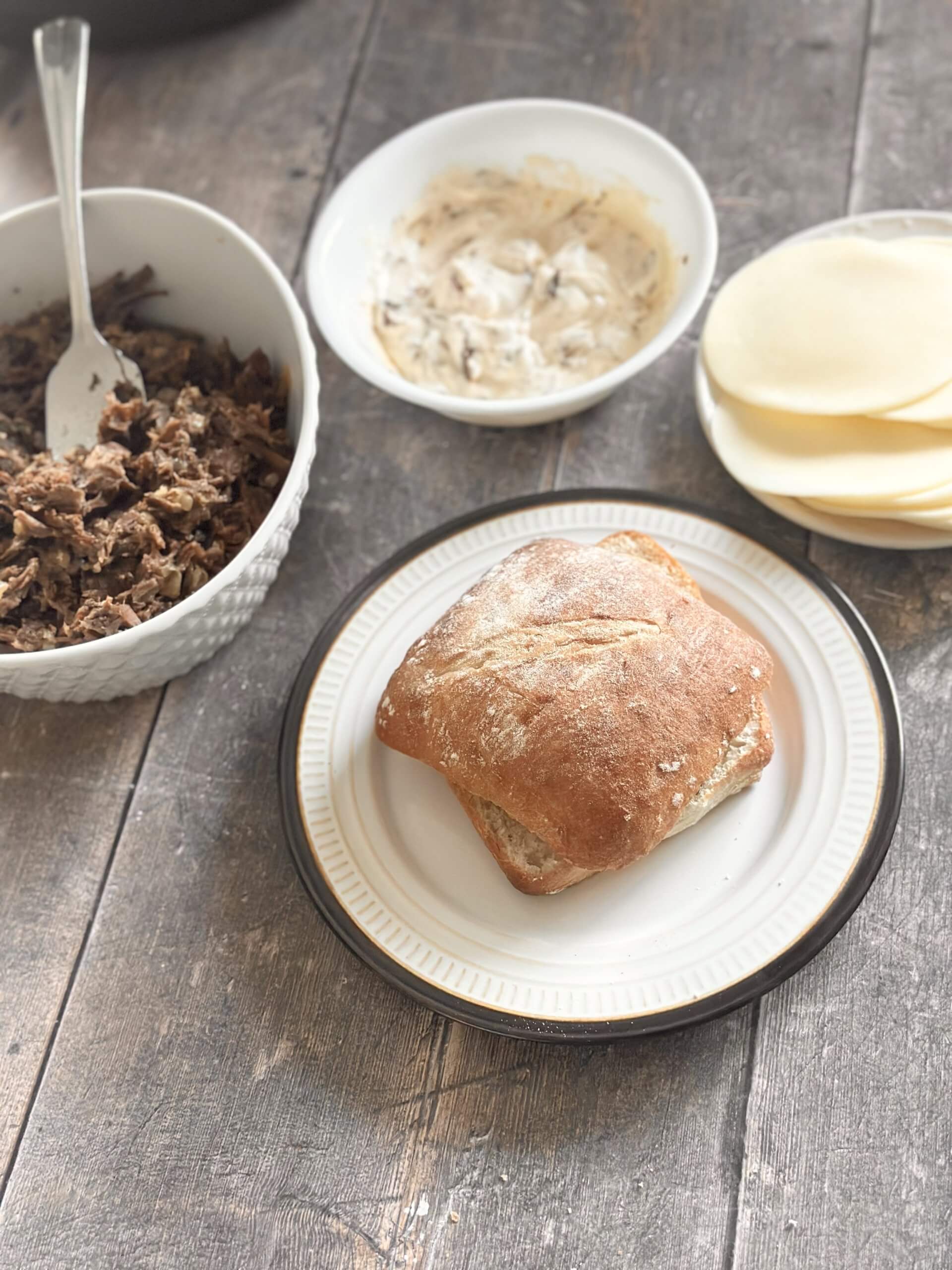 - Place some shredded beef on bun using a slotted spoon. Top with a slice of cheese before adding the top of the roll.