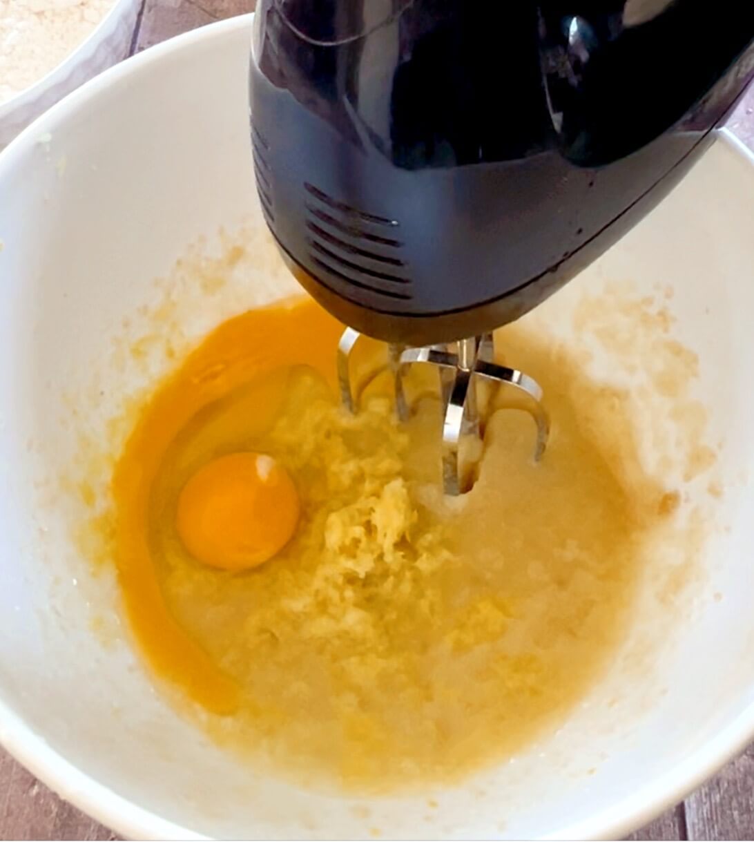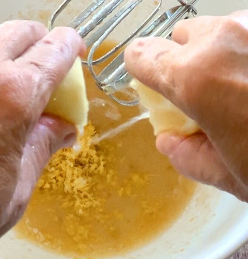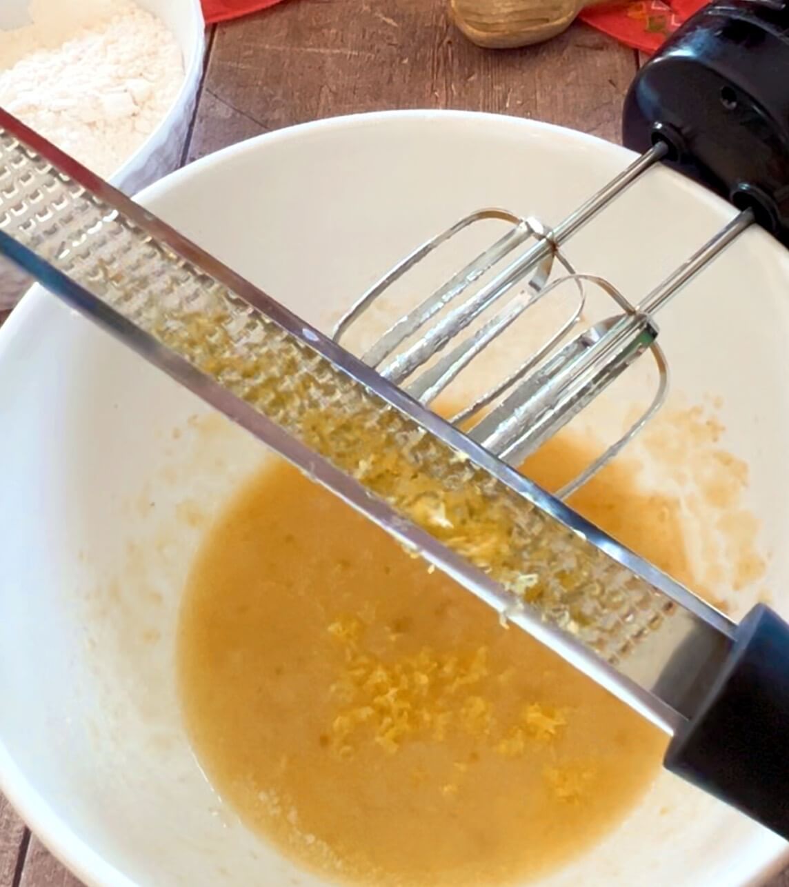 Add in fresh lemon zest, fresh lemon juice, 1 egg and 1 egg yolk and whip it up good.