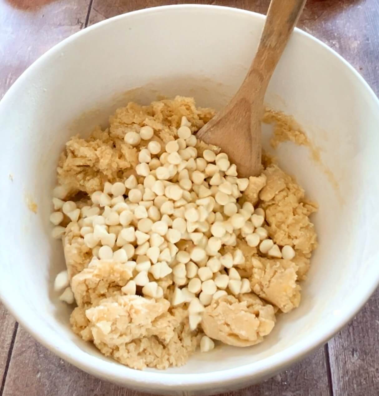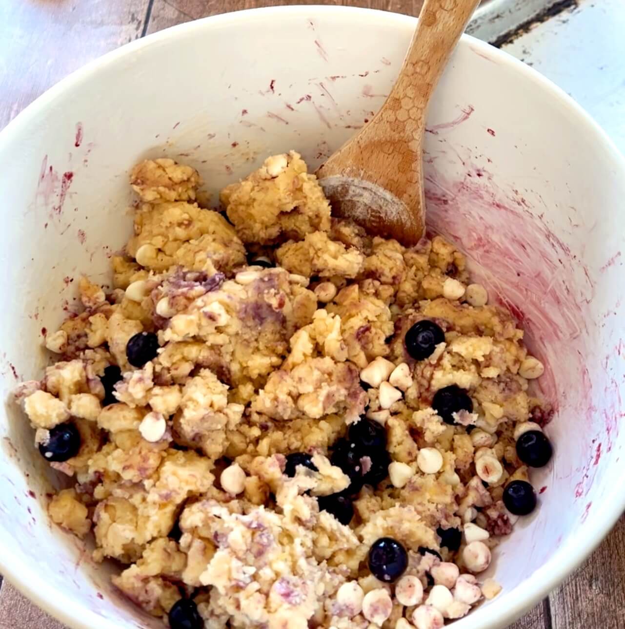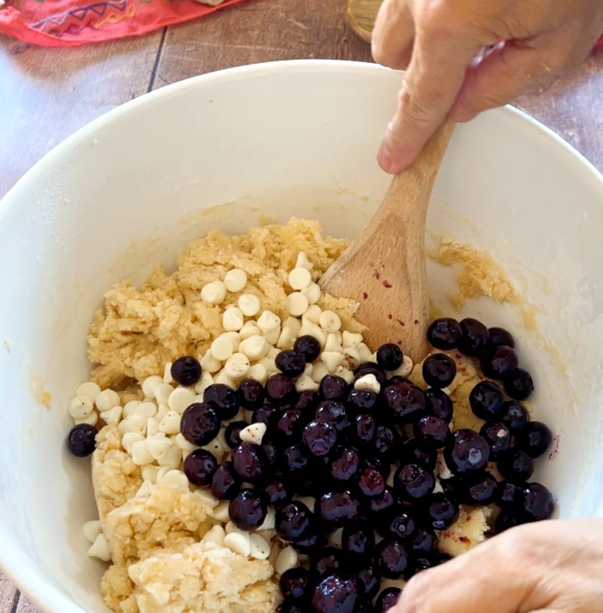 - Add in dry ingredients and mix until just incorporated.Stir in blueberries and *1 cup white chocolate chips.**If using frozen berries, keep frozen until ready to mix in.