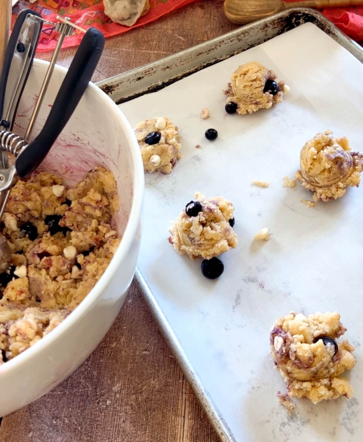 - Use a heaping large cookie scoop for each cookie. (About 3-4 Tbsp).Place about 2 inches apart, forming into balls and adding in additional blueberries as needed. Use your hand to gently smash each cookie.
