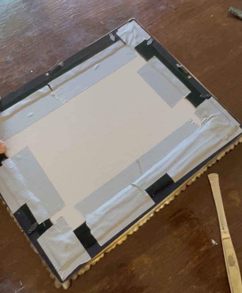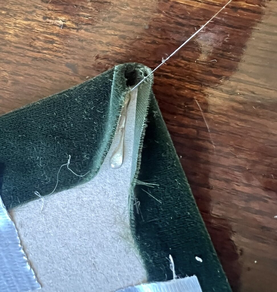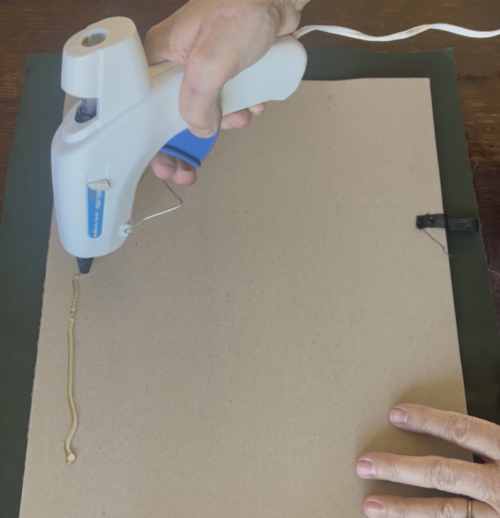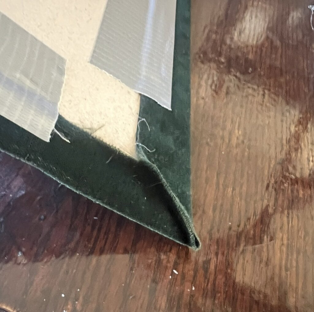 Lay the velvet right side down on the table and place the backing board on top. Use craft glue or a hot glue gun. Glue each side pulling fabric tightly. Don’t go all the way to the corners. Add Duct tape if you are neurotic like me.