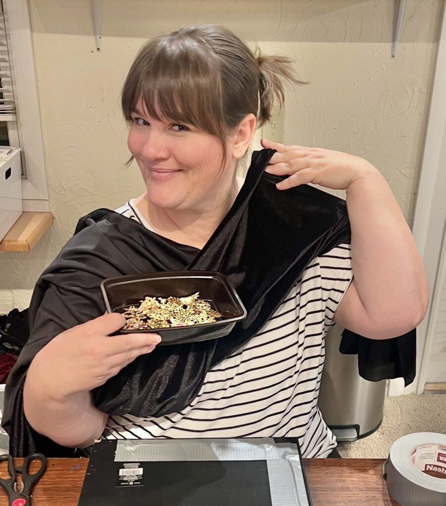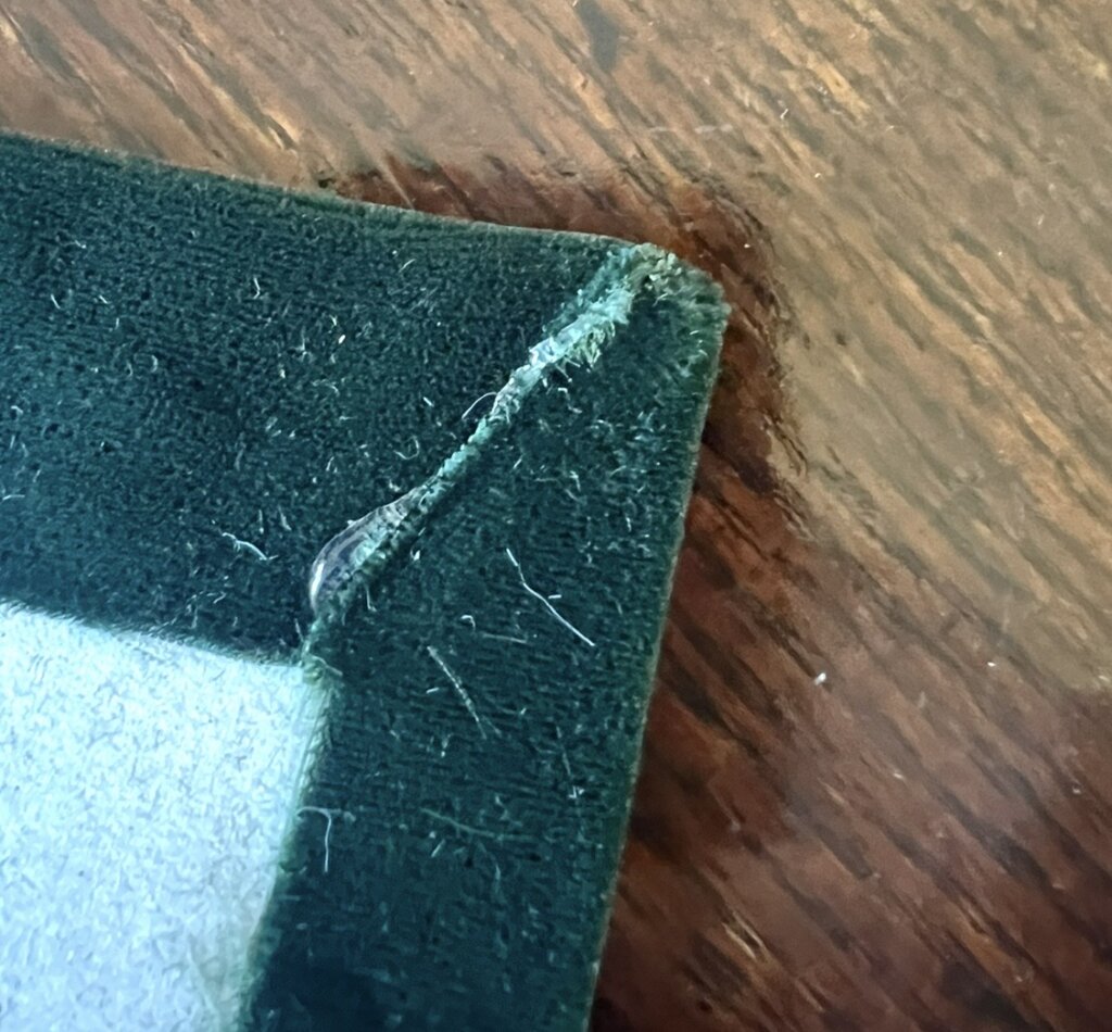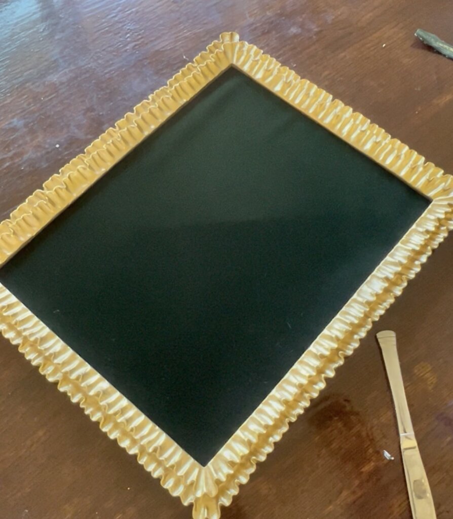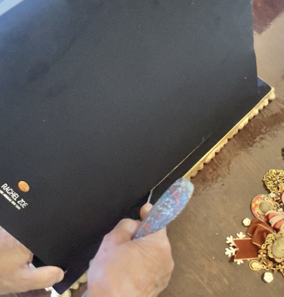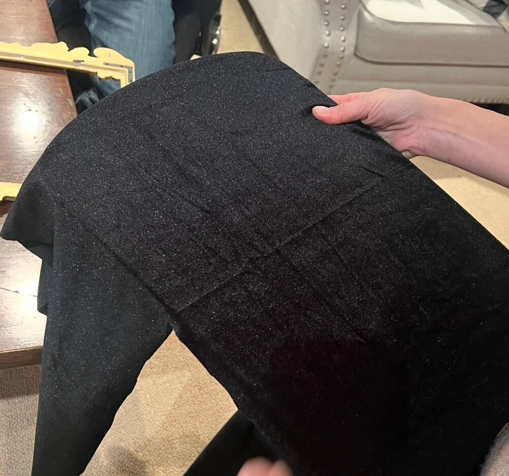 Lay the velvet right side down on the table and place the backing board on top. Use craft glue or a hot glue gun. Glue each side pulling fabric tightly. Don’t go all the way to the corners. Add Duct tape if you are neurotic like me.