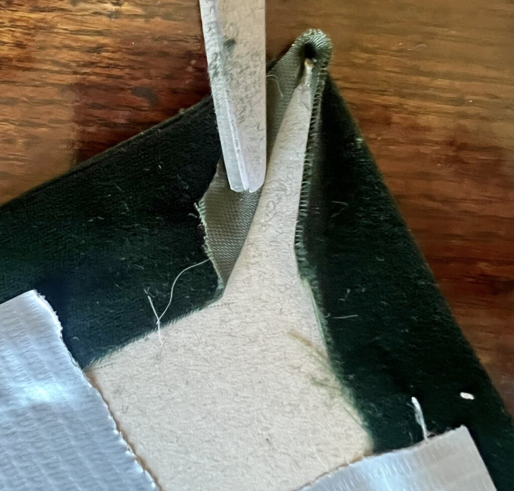 Pull the corners of the fabric straight up and cut the corner down to about 1/8″.