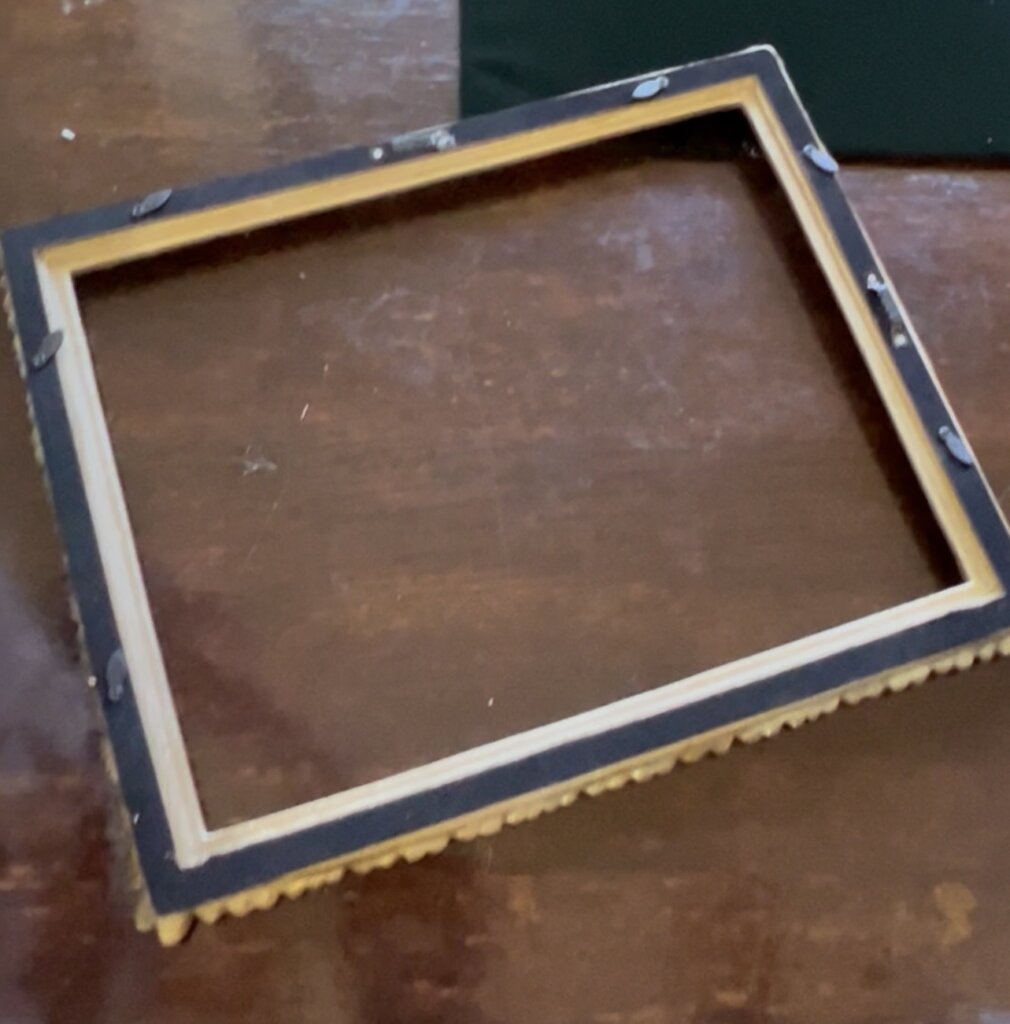 Lay the frame face down and place the board into the back. Use the metal fasteners if possible. The board may be a little large because of the added velvet so get it in as well as you can and tape into place.