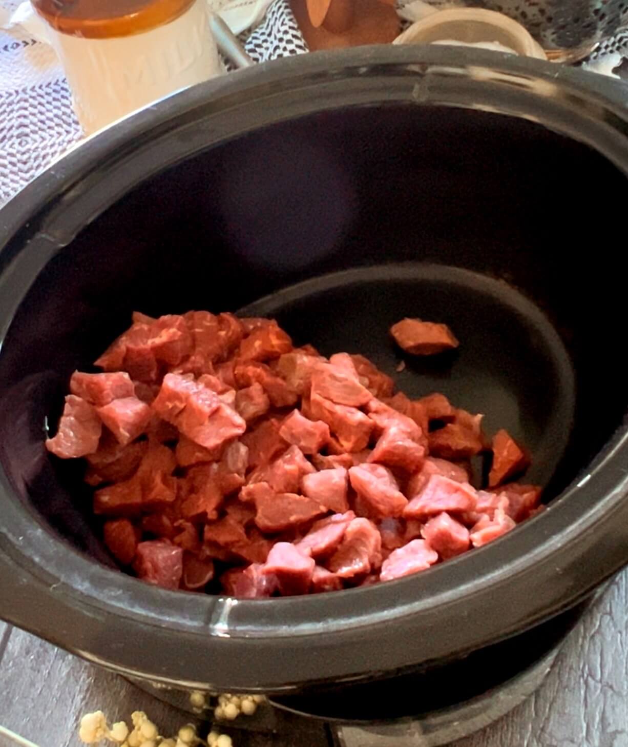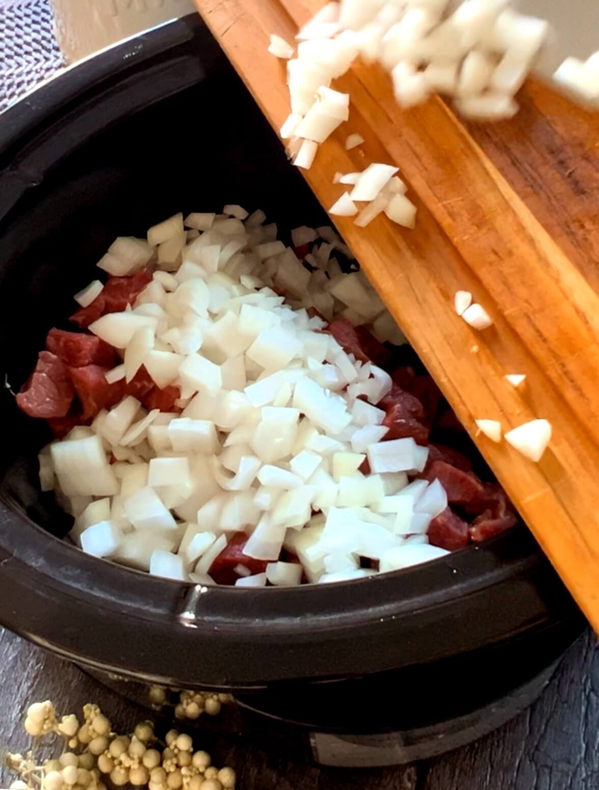 I usually buy a small roast that I trim really well. Cut that up into bite-sized pieces and throw it in the crockpot and top with a chopped onion.