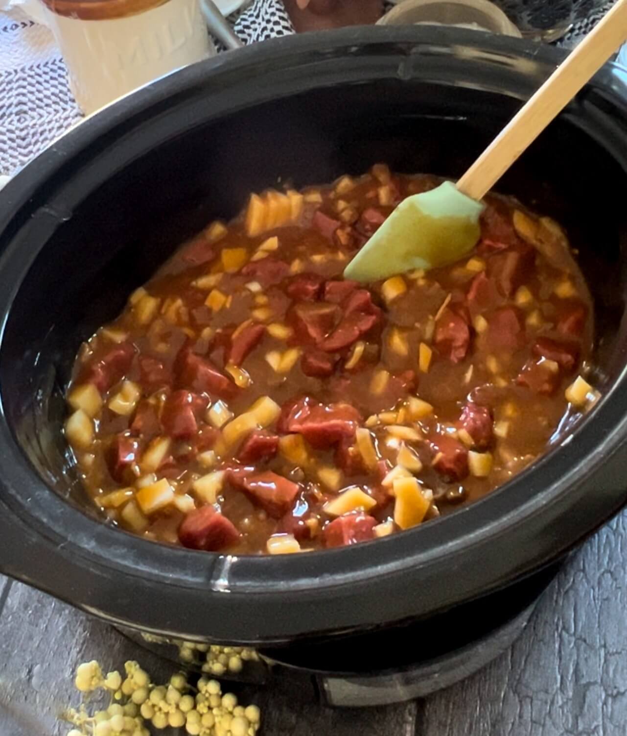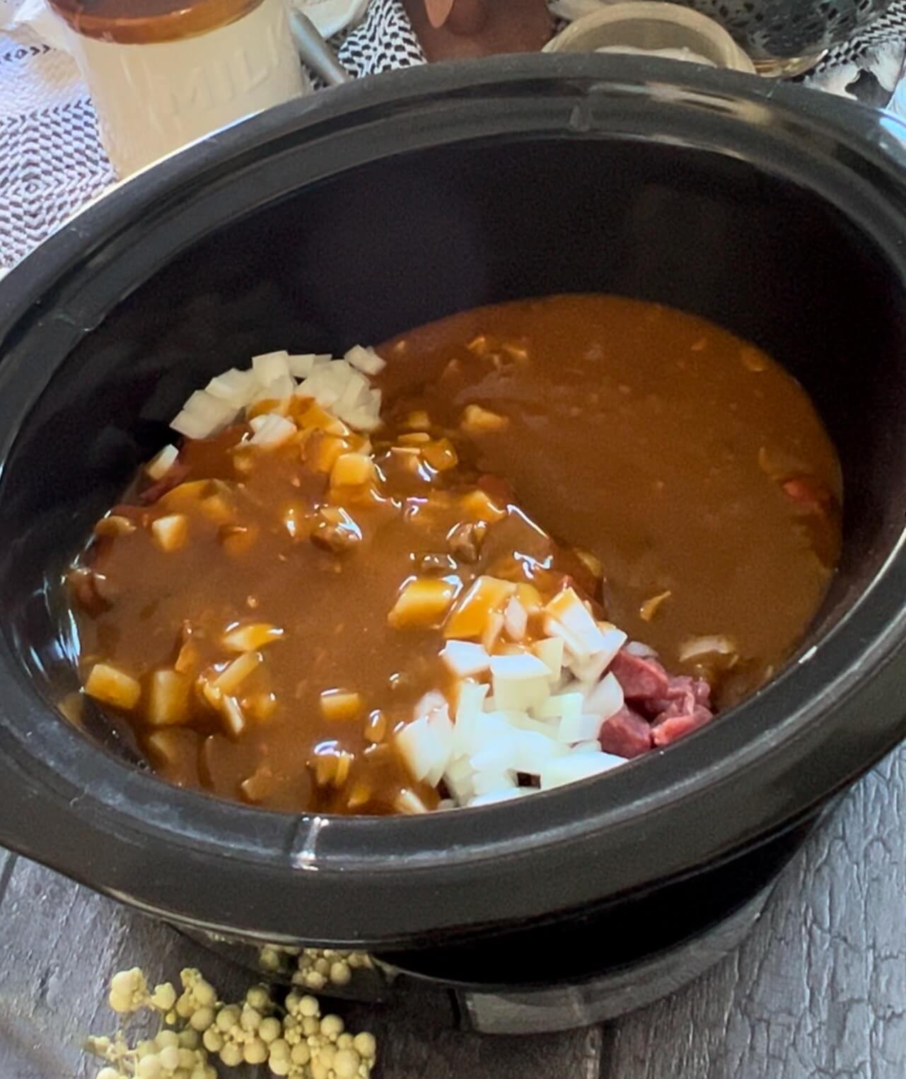 - In 2 quart or larger crockpot, add meat and onions.