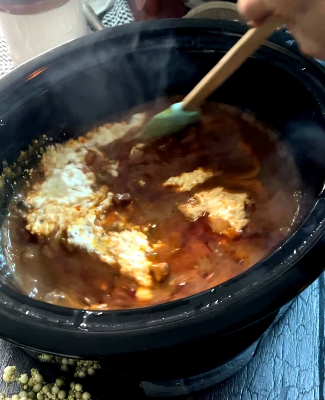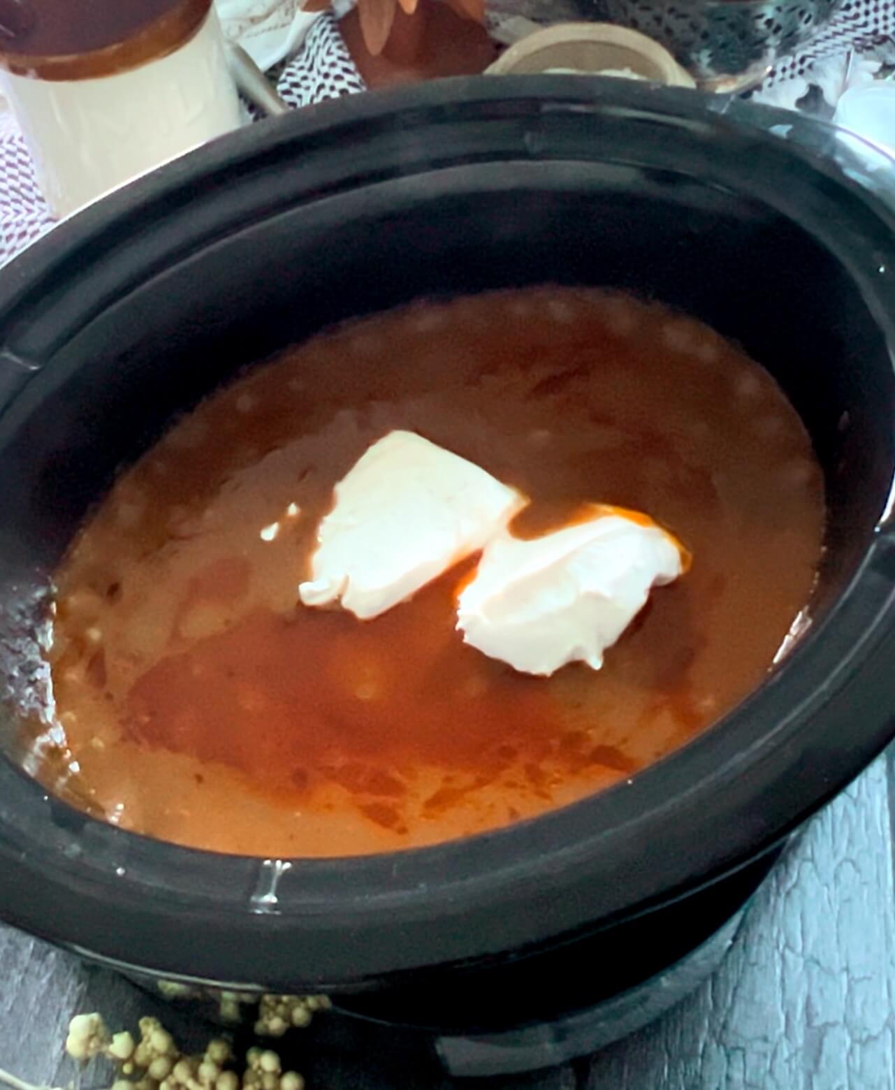 Remove the lid and add the cream cheese and sour cream. Put the lid on allowing the cheese to melt and mix in.
