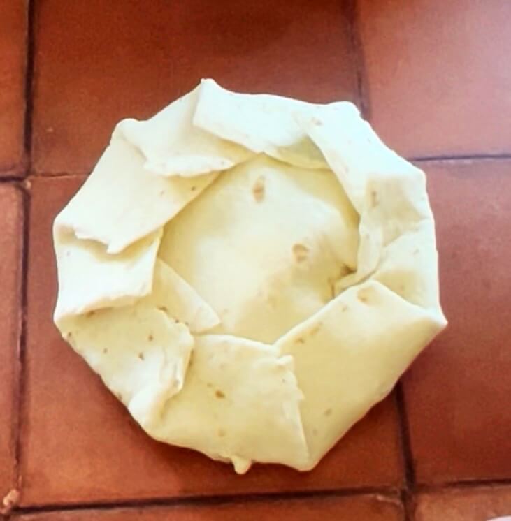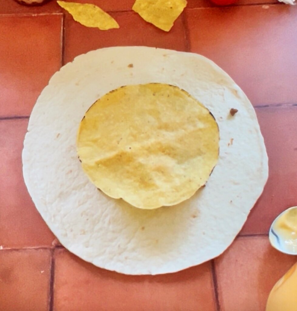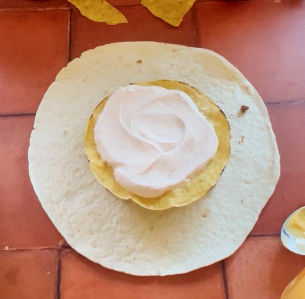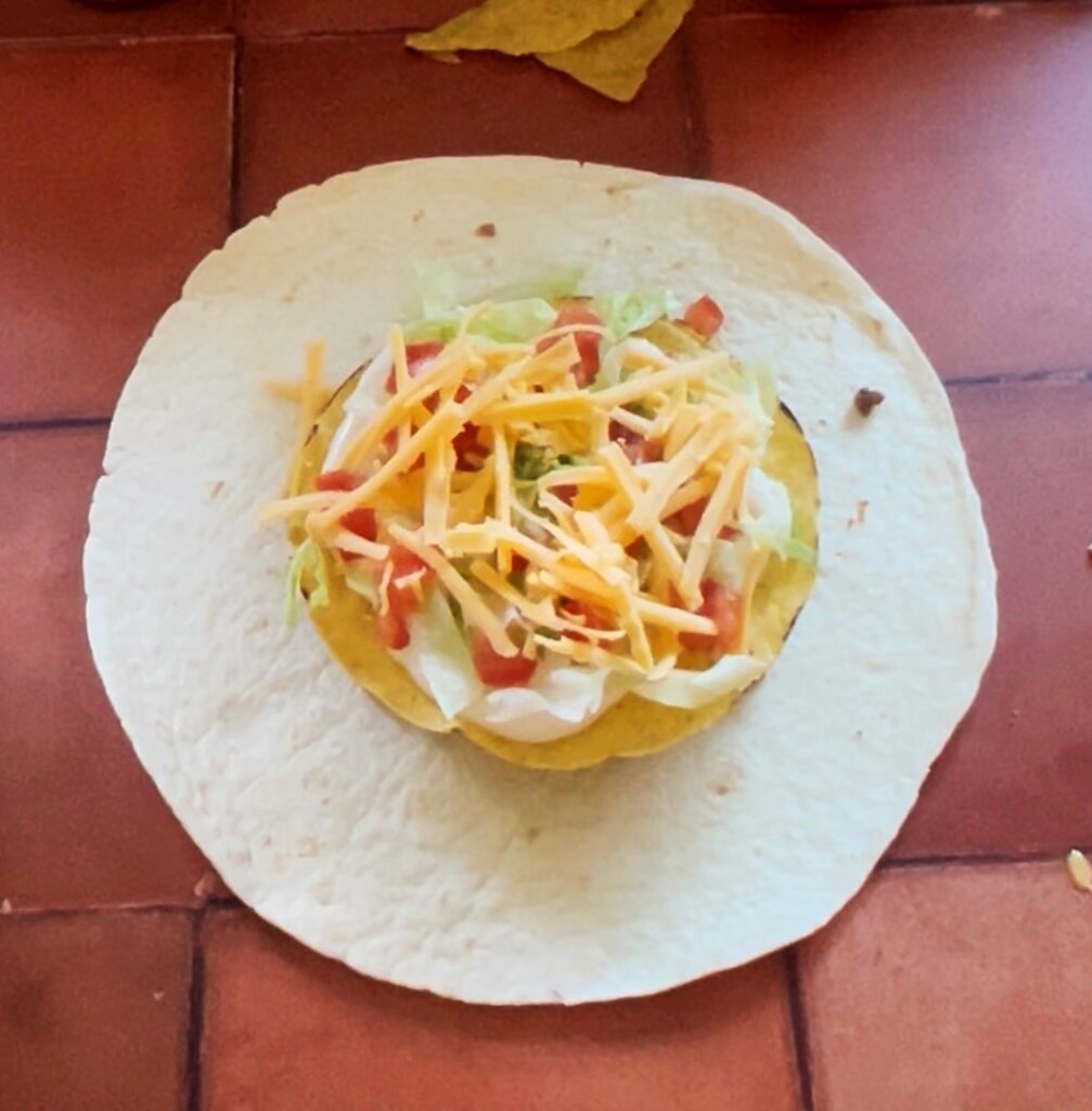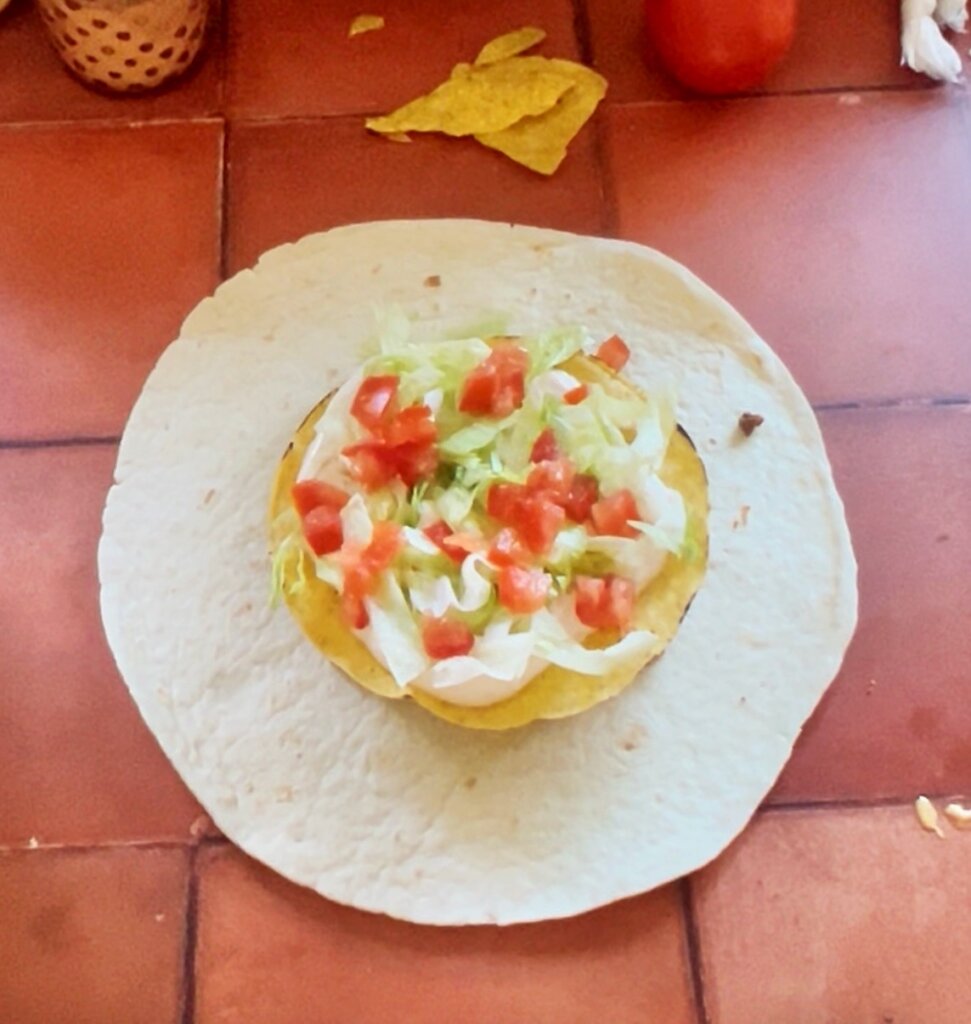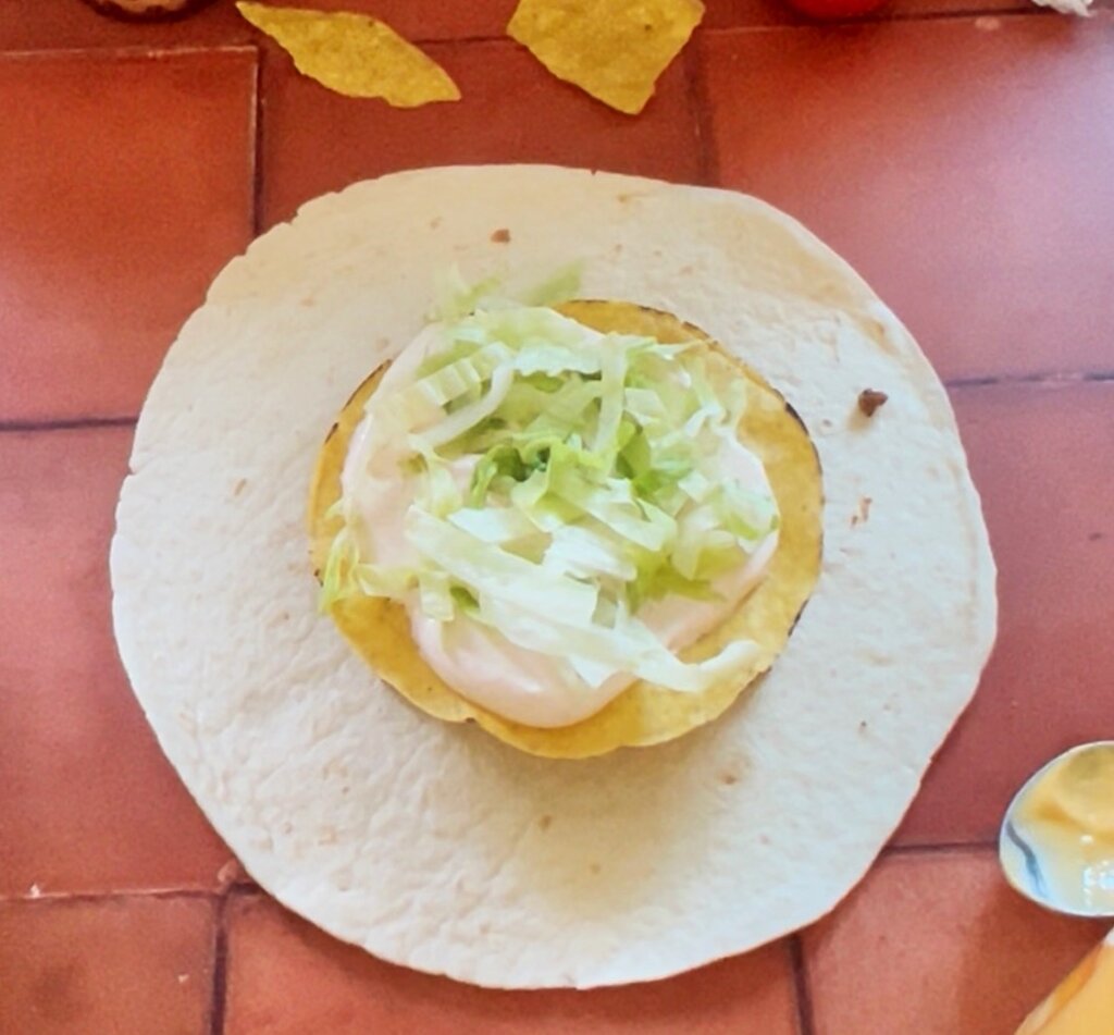 - 1. Lay a large tortilla onto surface. 2, Spoon about ½ cup of filling into center. Spread to about 4 inches in diameter. 3. Dollop on about 3T of queso and gently spread.4. Top with a tostada shell.5, Spread with about 2T of spicy sour cream.6, Top with around ⅓-½ cup of the lettuce.7. Sprinkle with diced tomatoes.8. Top with a little shredded cheese, about ⅓ cup.9. Place a small flour tortilla, or tortilla piece, in the center. 10. Fold up one side and then make small pleats folding all into the center.