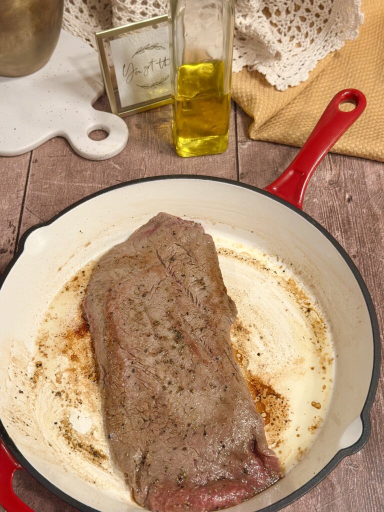 Heat a large skillet. It does not have to be a cast iron skillet, if you do not have one. Just get the skillet hot. Drizzle olive oil in the skillet, then use a large fork to lay the steak in the skillet. After 1-2 minutes, turn it over, searing both sides.