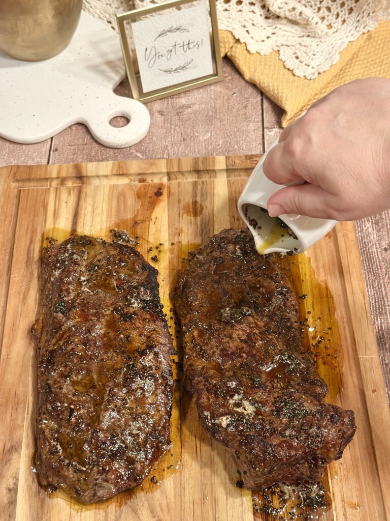 Pour the garlic herb butter over the resting steak before cutting it. The butter is not required, but it does add some extra oomph!