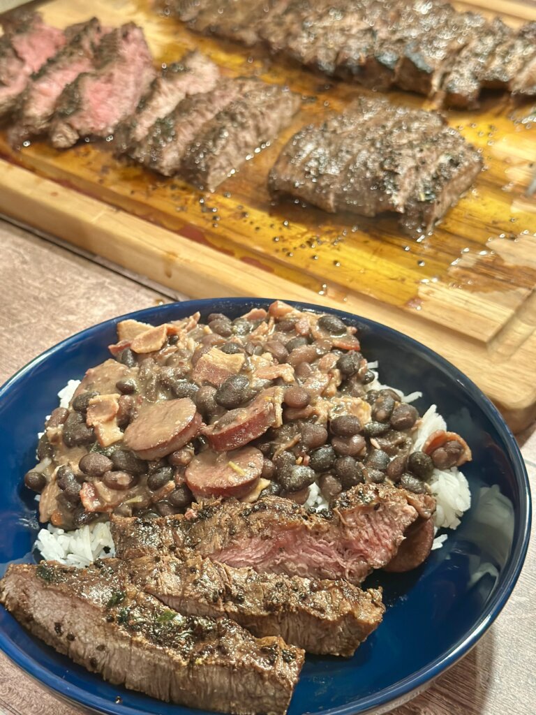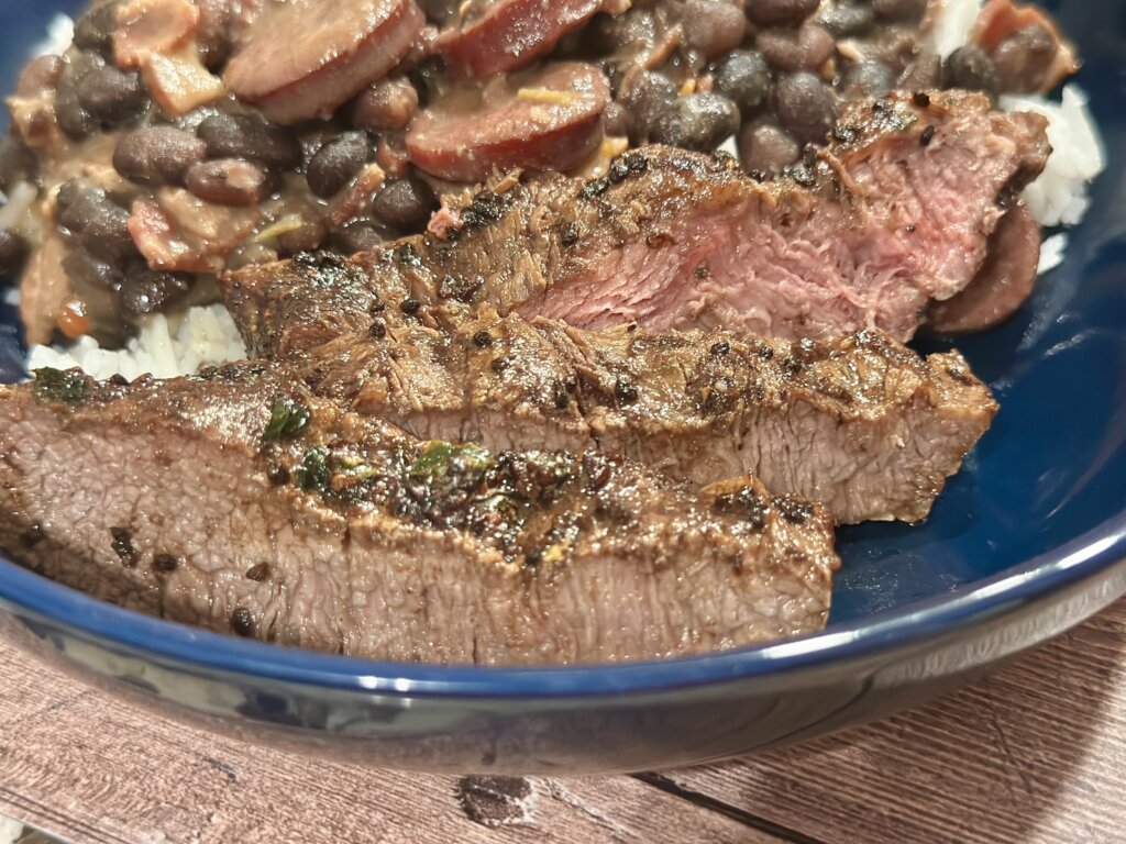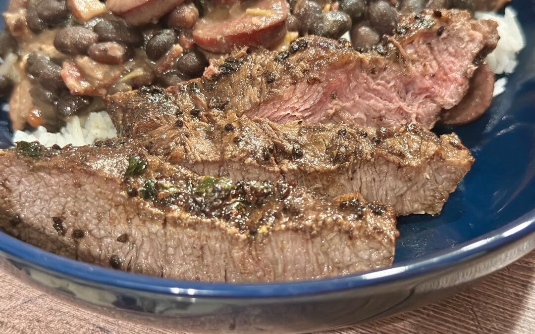 If you want to go Brazilian, serve this delicious steak with Feijoada – Brazilian Black Bean Stew. Other great ideas for the side are right here –