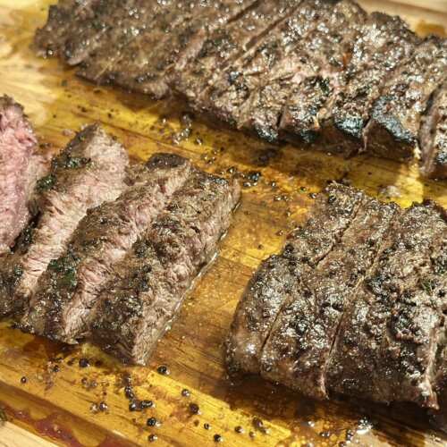 - While the meat is resting, drizzle the garlic herb butter over the steaks before cutting. Slice into ¼ inch thick slices for serving.