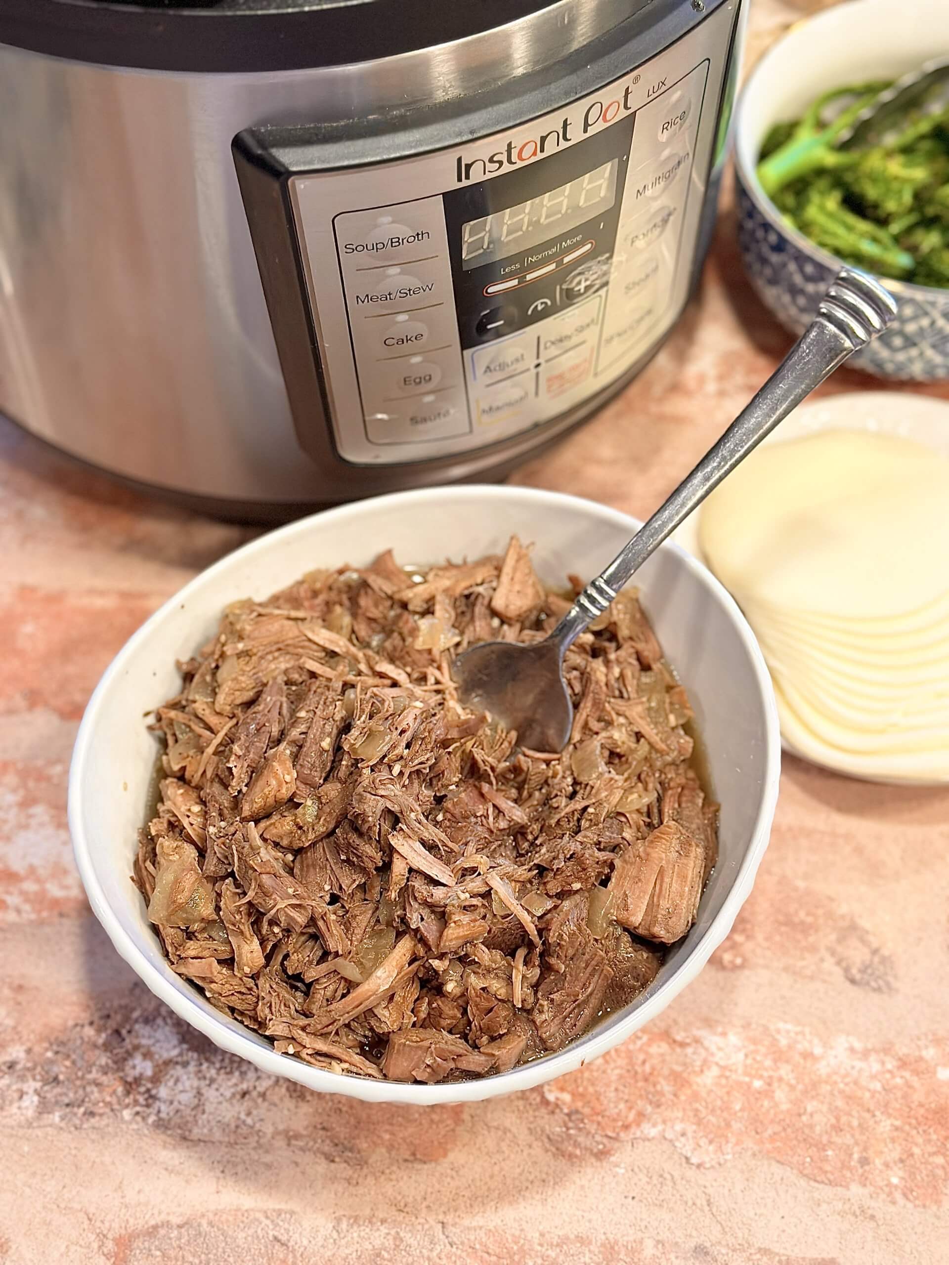 Lock the lid on and set the timer manually to 40 minutes. When finished, release the steam before removing the lid. Use two forks to break up beef.