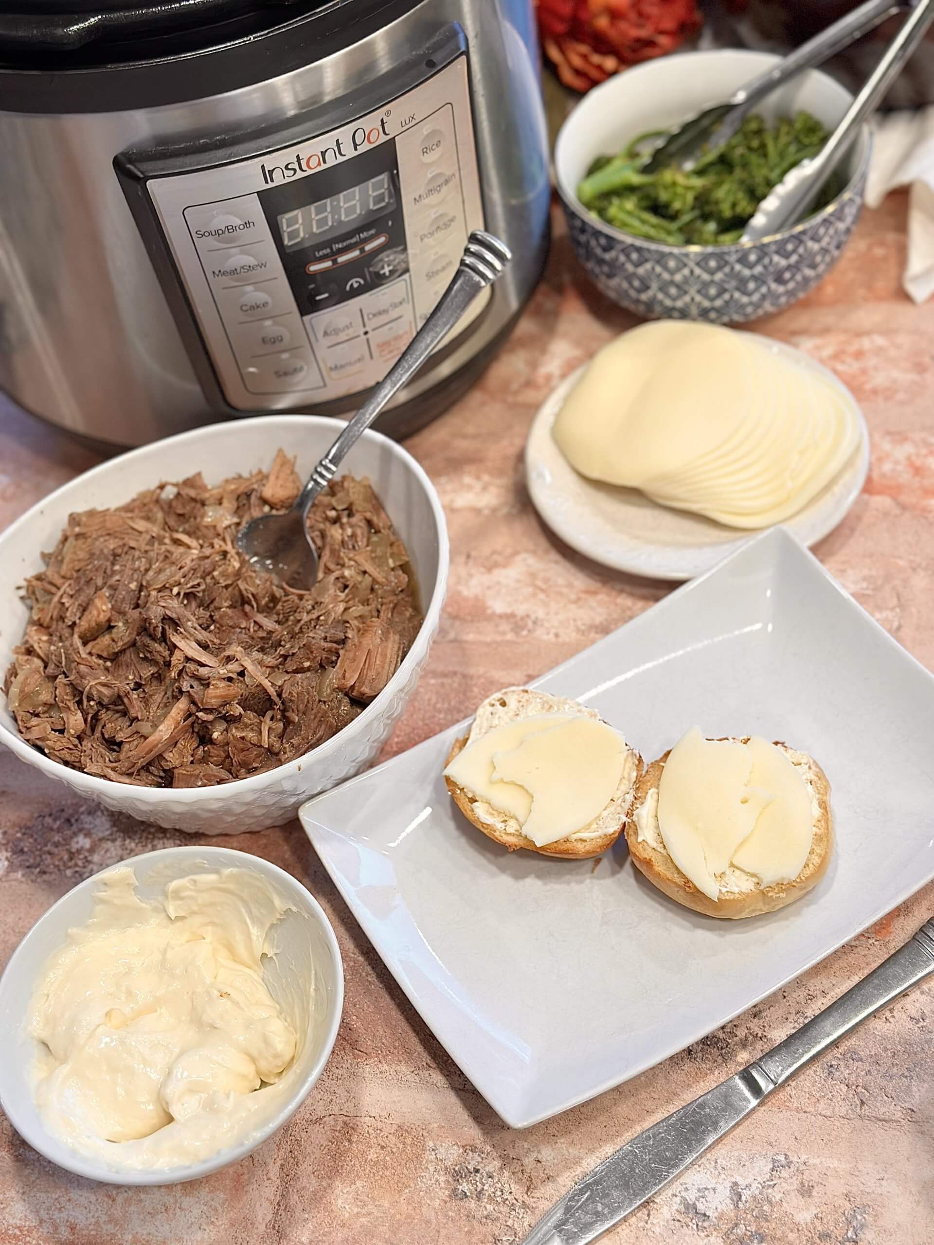 - Prepare a sandwich by spreading the mayo mix on each side of the bun. Add some slices of provolone cheese, then add about a ½ cup of the beef. Ladle some of the liquid from the pot into a small bowl to use for dipping.