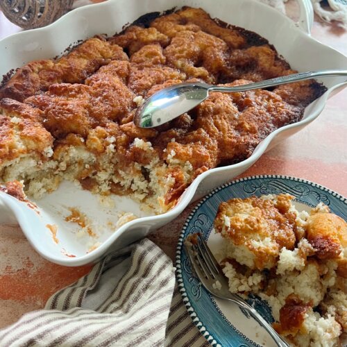 - Pour over the batter in the baking dish. Use a metal spoon to spread the cinnamon topping, and then gently press and cut, with the spoon, in a random pattern.