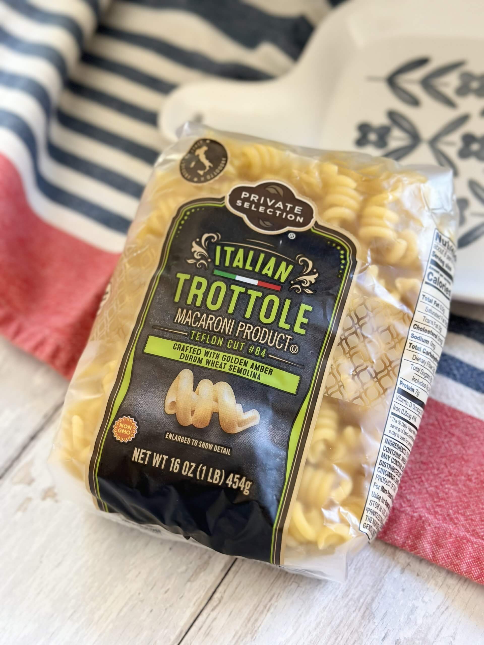 My favorite pasta to use for this salad is Trottole. It is such a great texture and the coils hold in the crumbles of Feta and other bits of flavor really well.