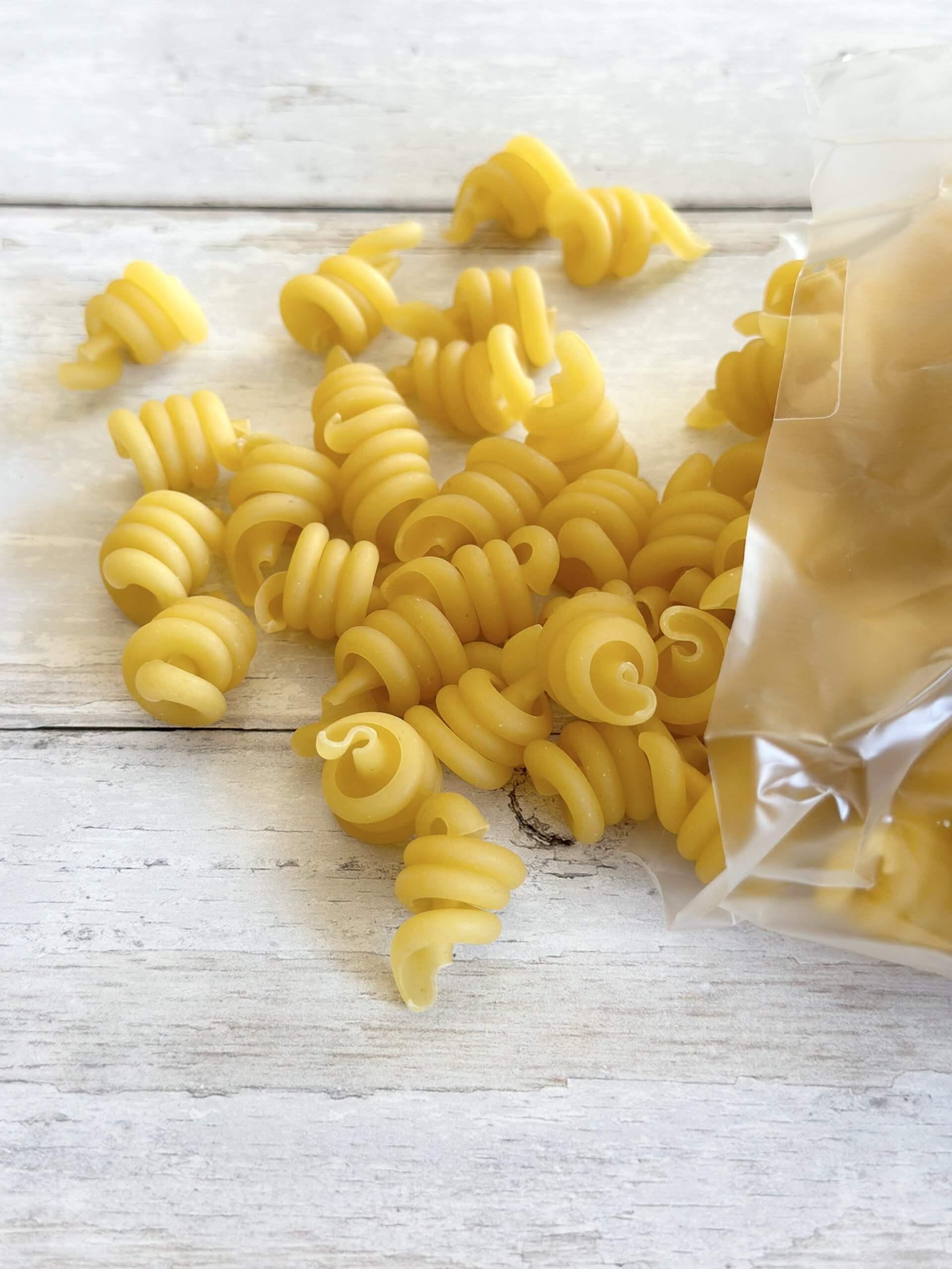- Cook the pasta according to the package. Test a piece before draining, to make sure it is fully cooked and not too chewy.