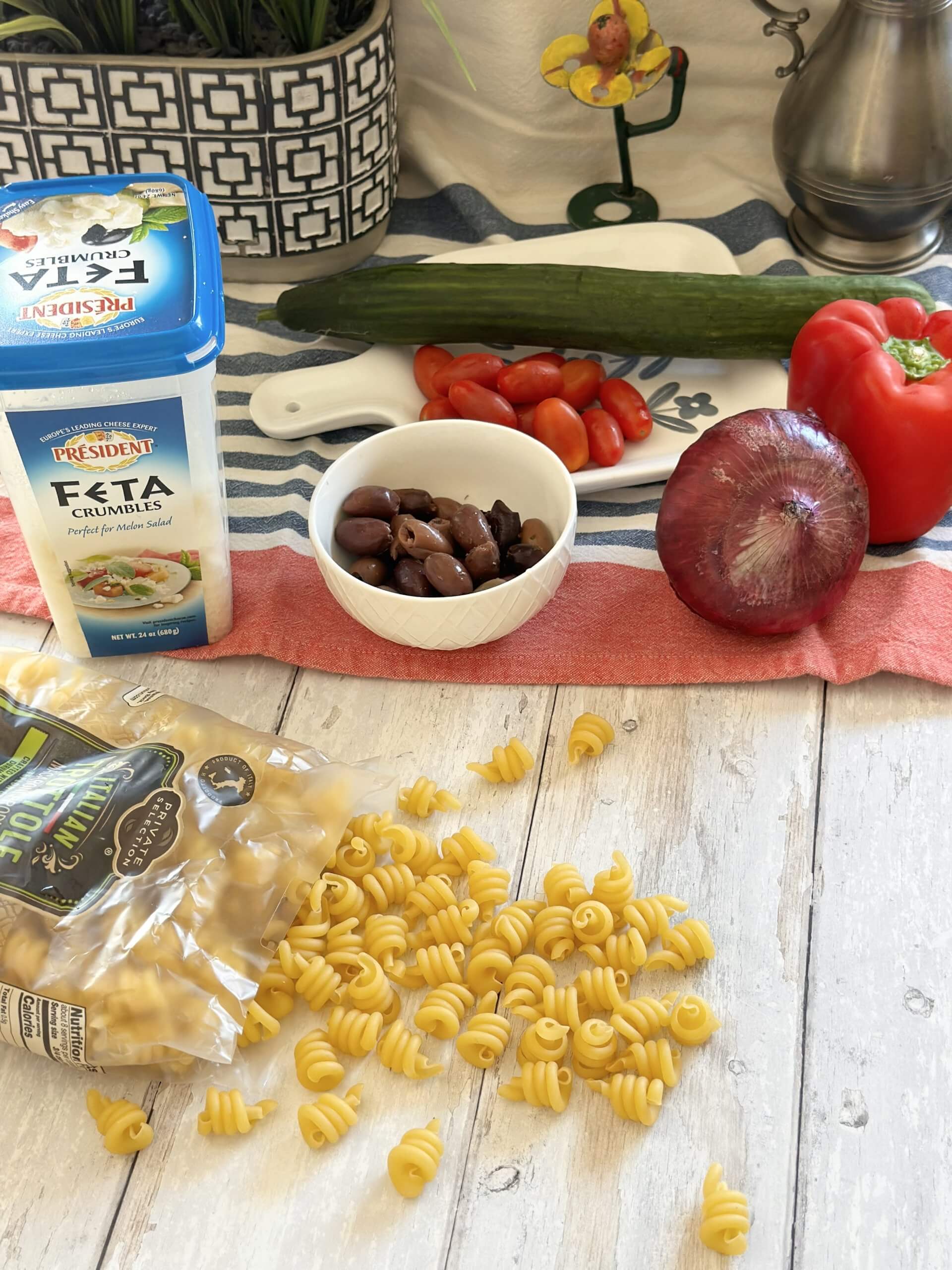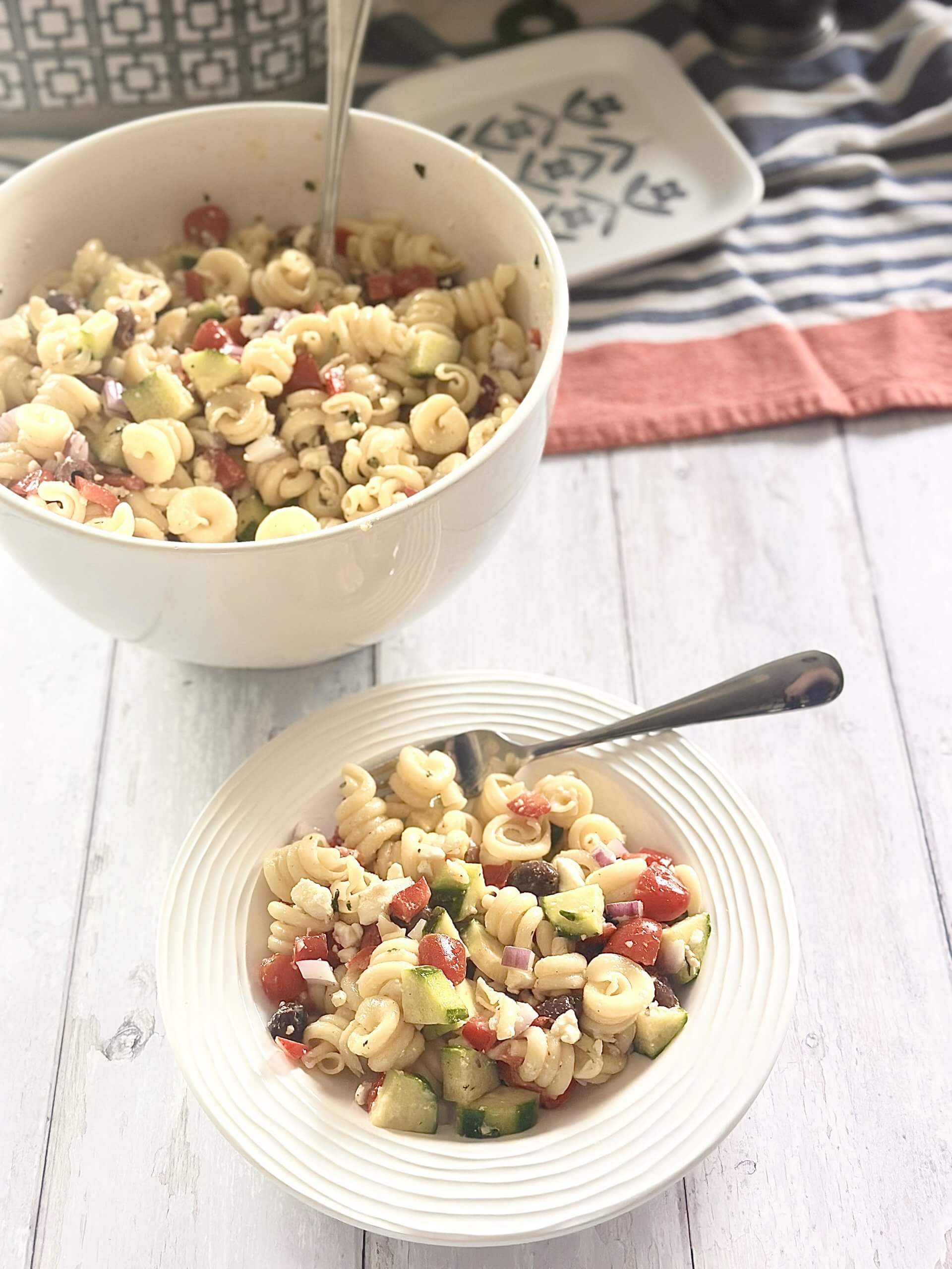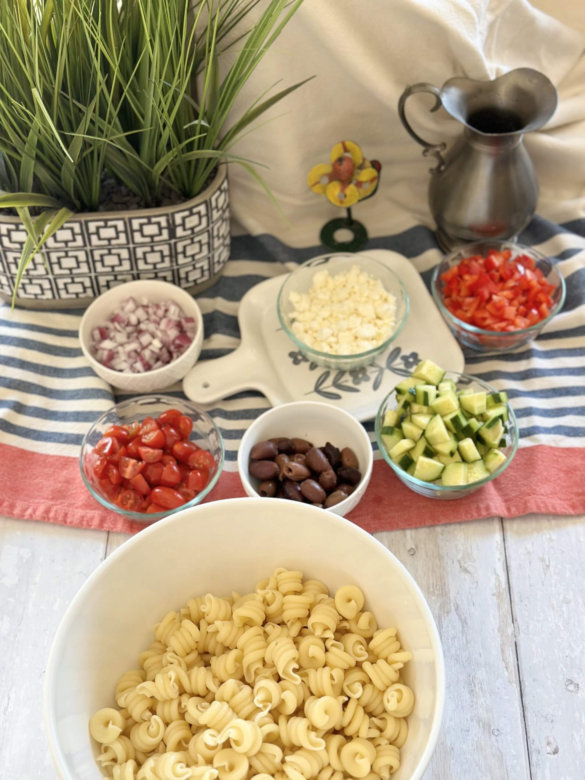 The first time I tried out making a Greek pasta salad, I was in Las Vegas visiting my sister. We were all having so much fun playing out in her pool. We made the first version of this salad for lunch and ALL of us, my family and hers, LOVED it! I’ve now been making it and tweaking it for 2 years. It is one of our favorites.