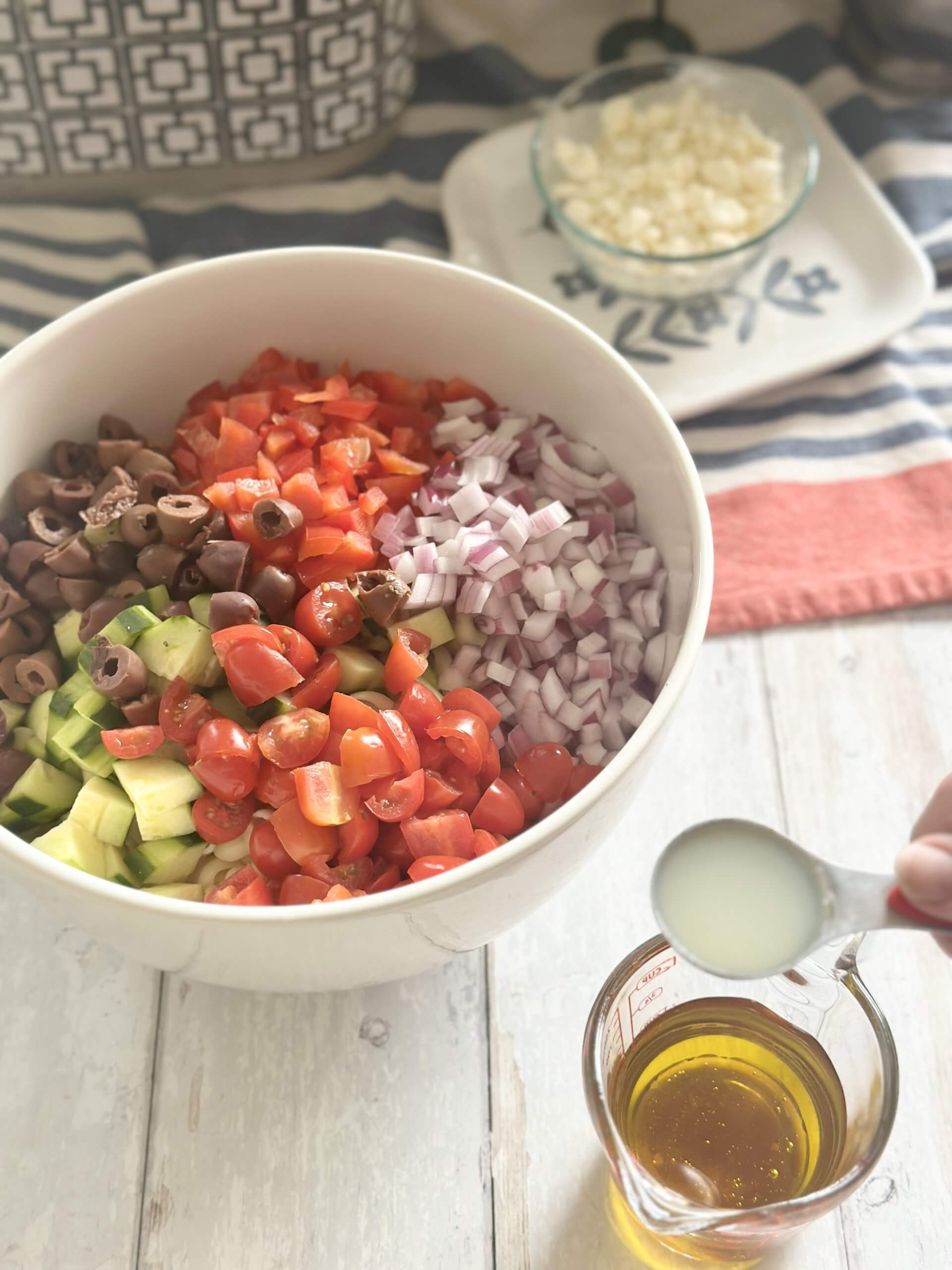 - Add all the prepped vegetables, including the olives. Toss and stir well. Add the Feta cheese and pour the dressing over top. Stir from the bottom, and lift over the top again and again till the dressing is well distributed.