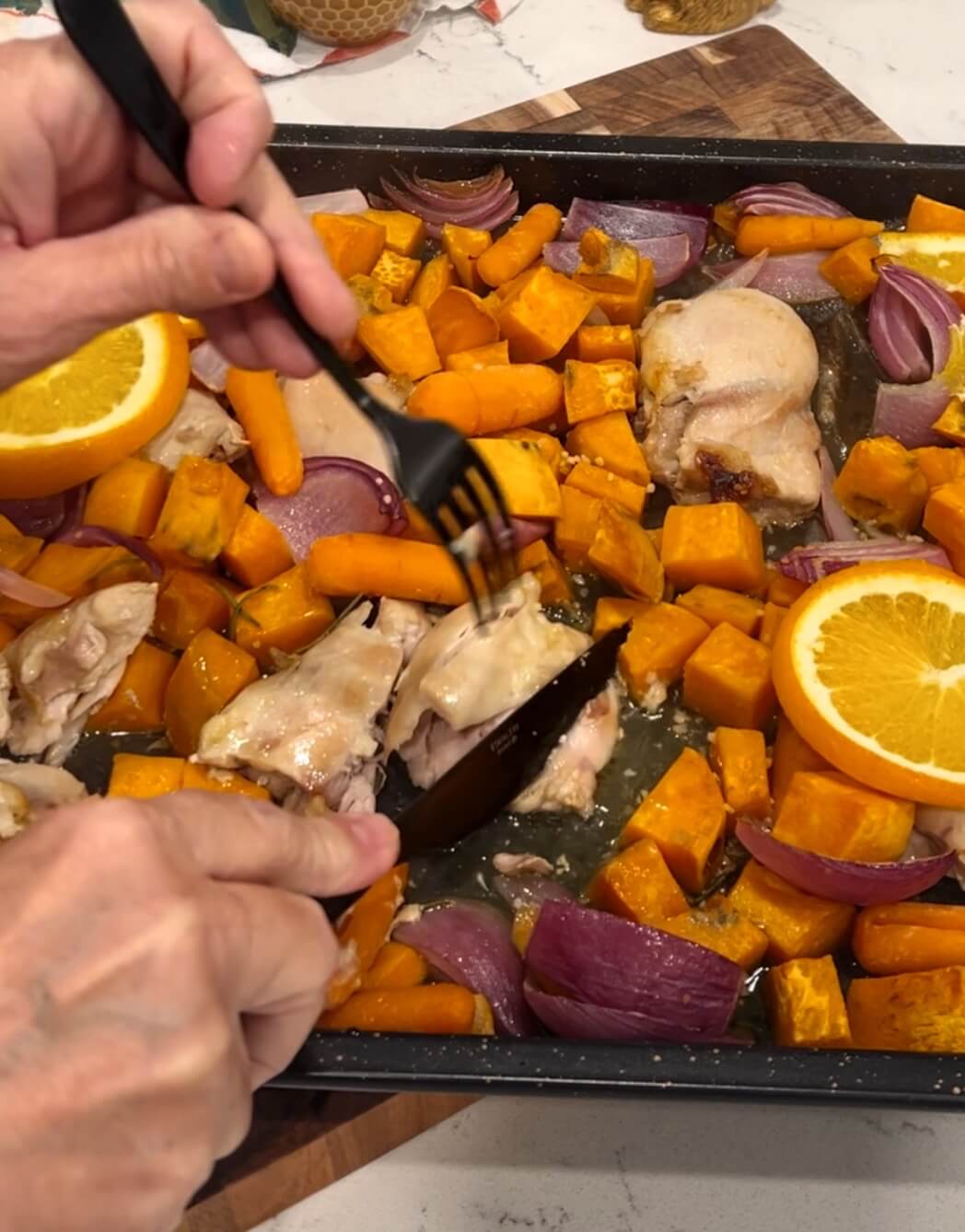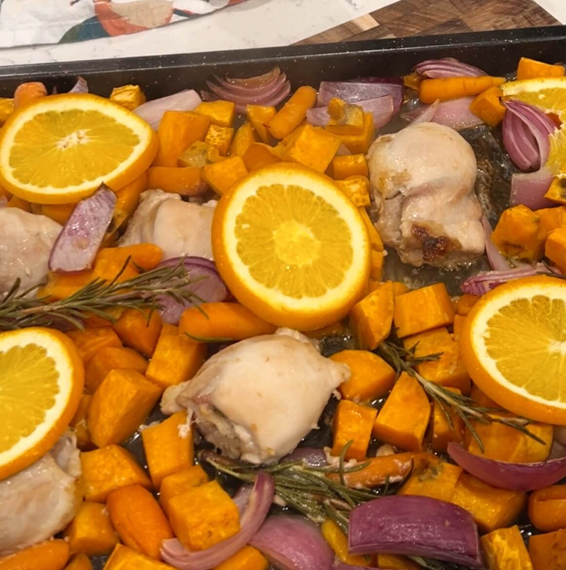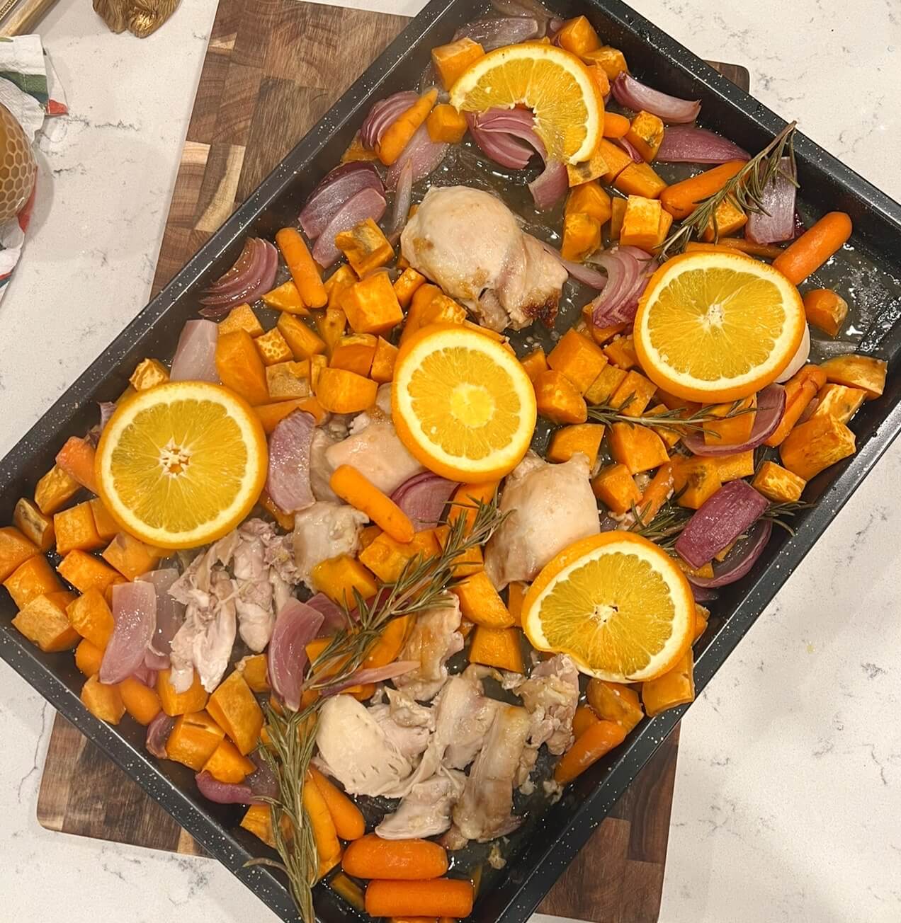 - Cut the remaining orange into slices and spread them over the chicken and veggies.