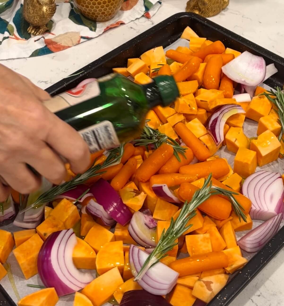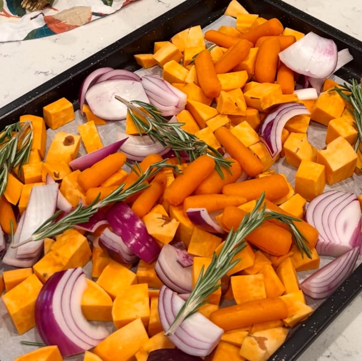 Cover a sheet pan with foil…don’t use parchment paper…it makes a wet mess. Spread all those pretty veggies out.