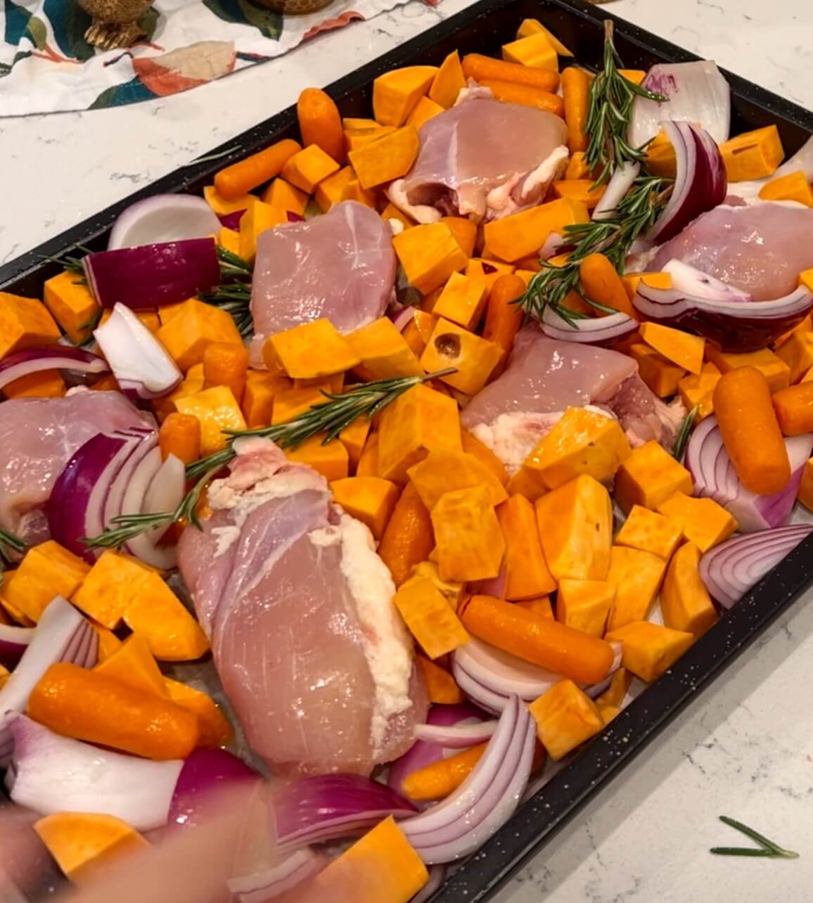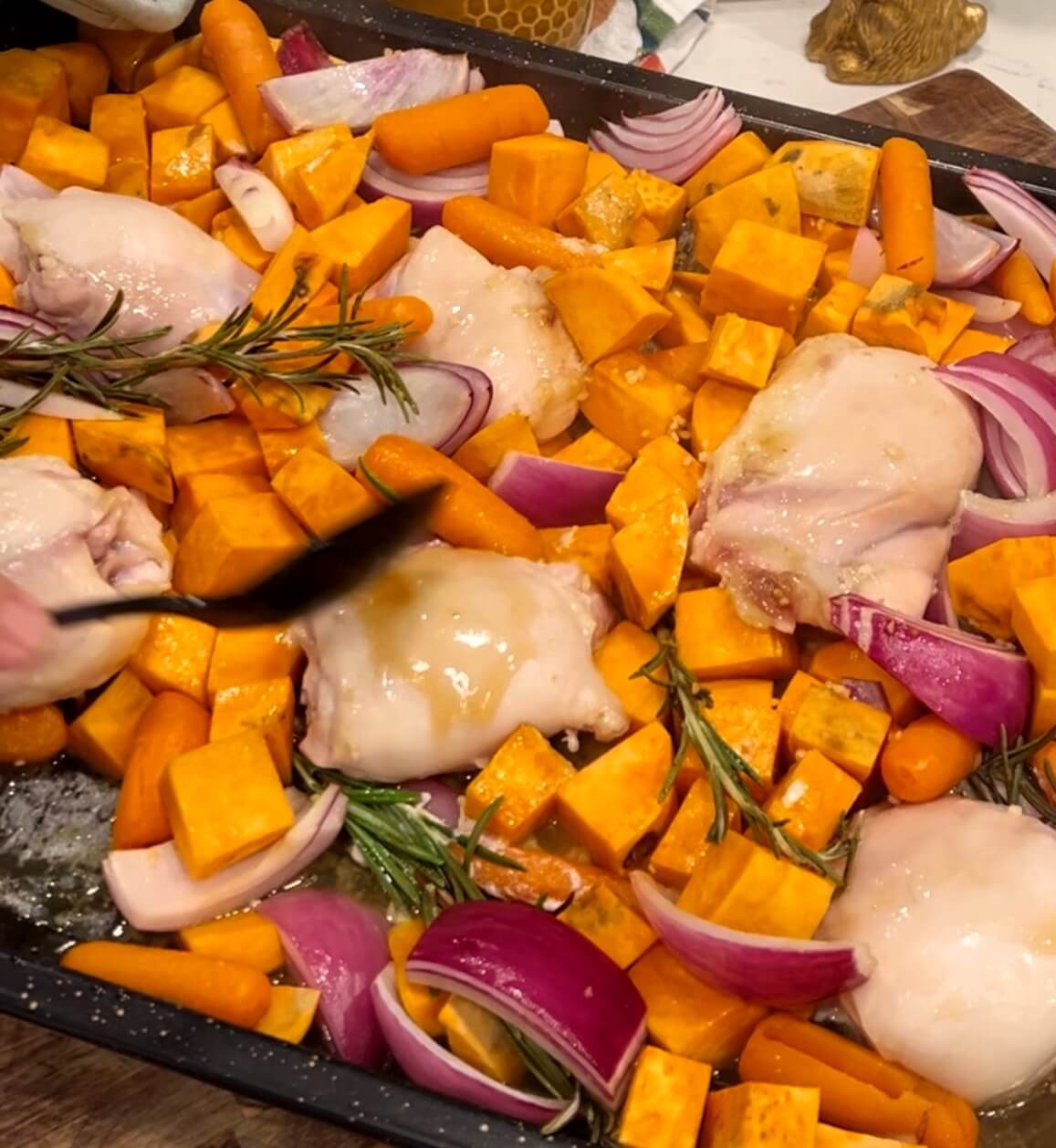 The smell alone makes this worth making. Roasted sweet potatoes and onions with tender chicken thighs in a honey garlic sauce with fresh rosemary. Heaven. @mostdeliciouslife.com