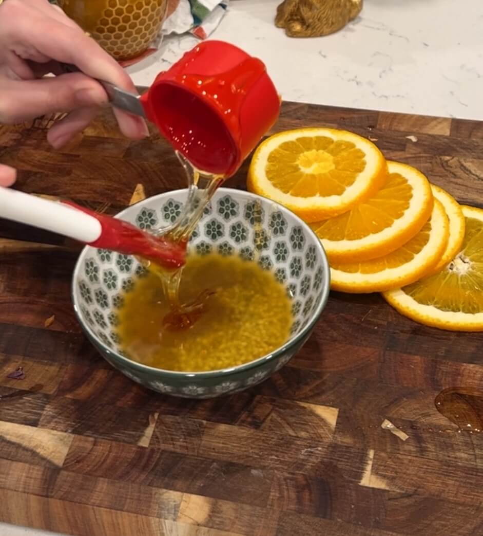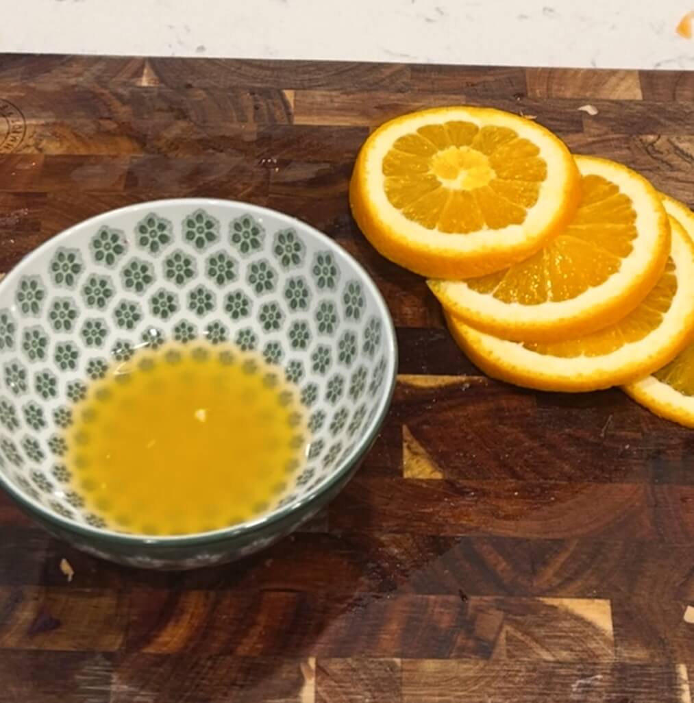 - Cut and juice one orange. Add the honey, soy sauce and garlic. Whisk together.