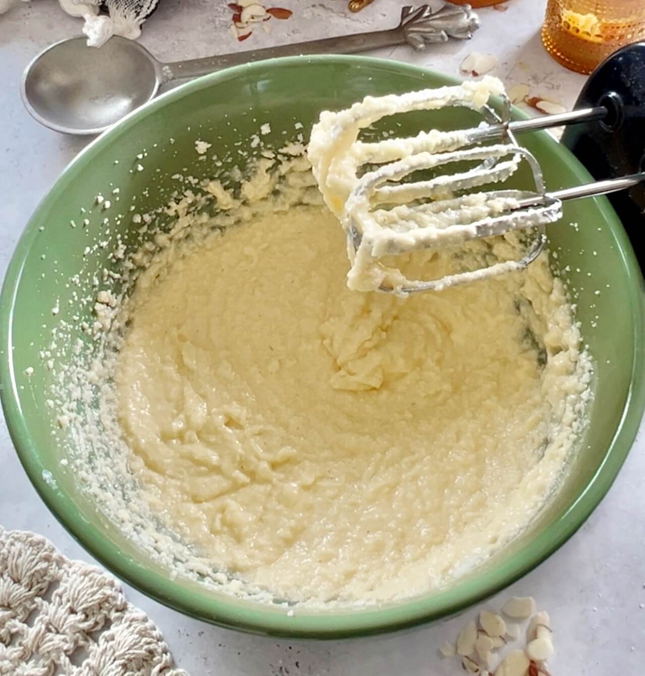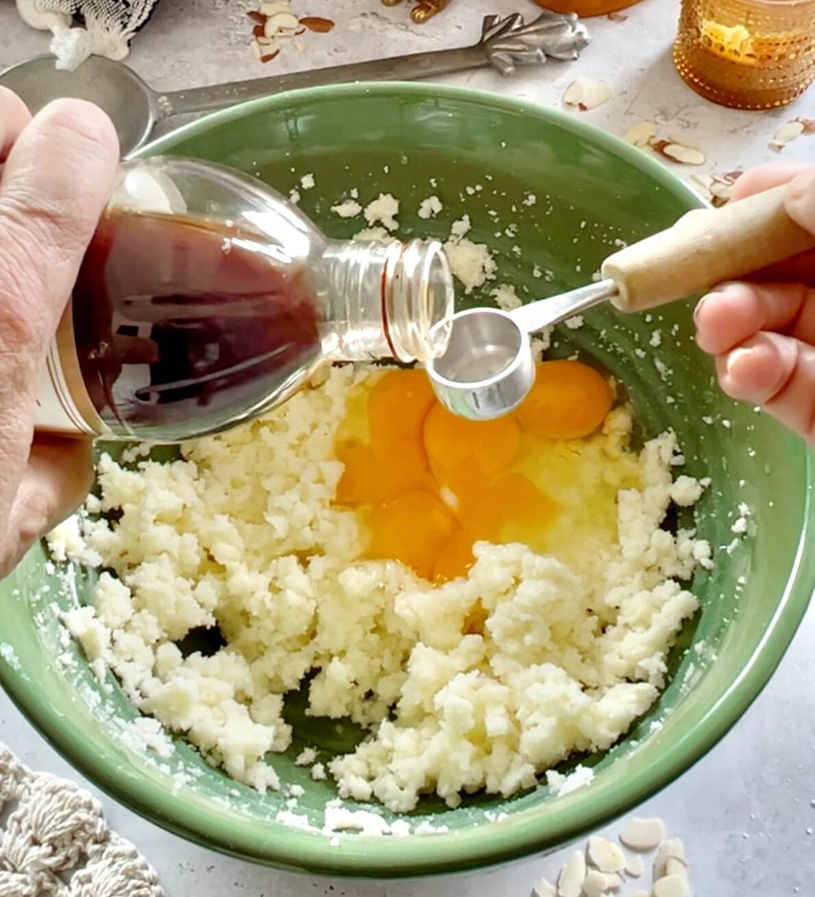 - Add eggs, vanilla and almond extracts. Mix well.