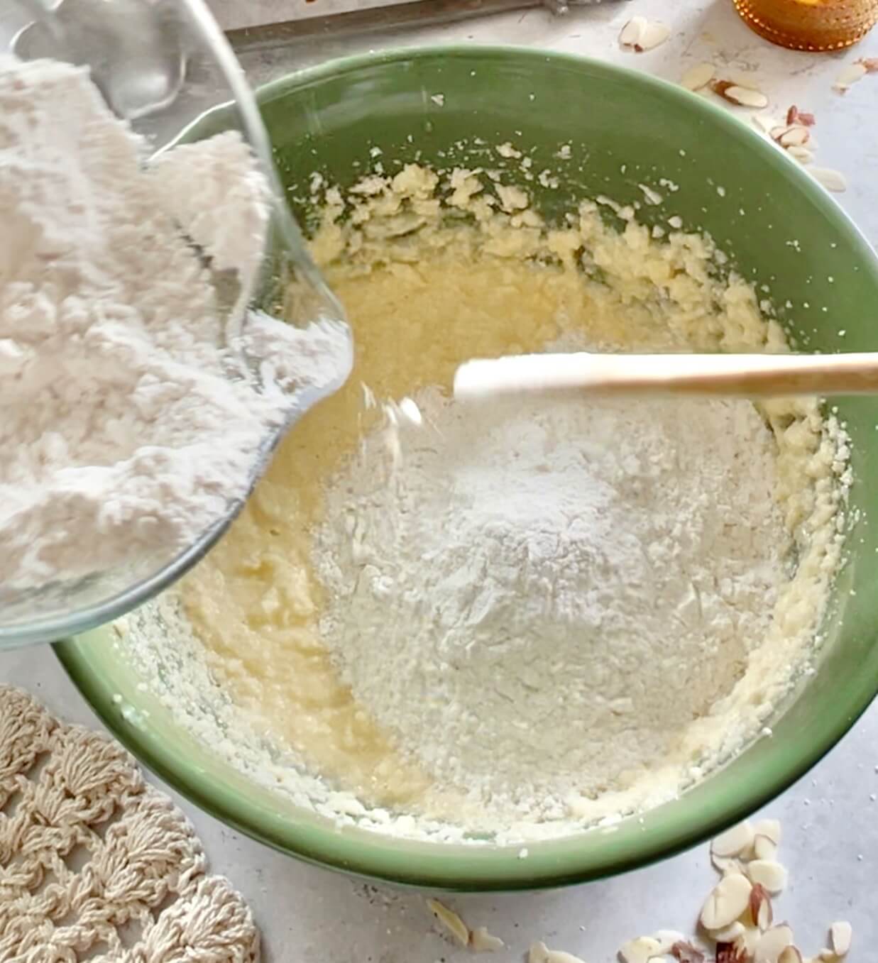 - Add about ½ the flour mixture to the butter and egg mixture and mix well.