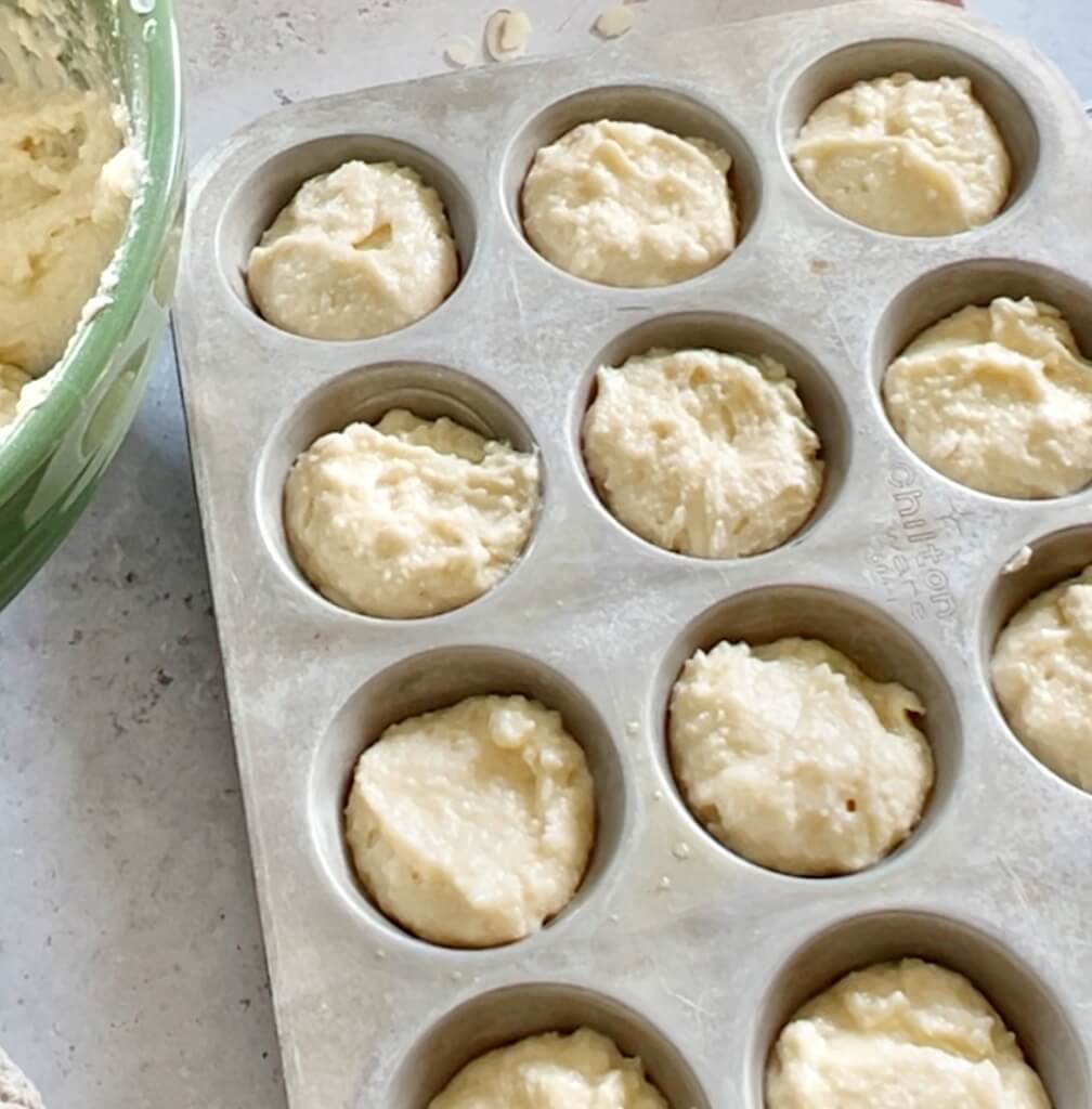 Fill sprayed muffin tins about 3/4 full. Top with sliced almonds and bake.