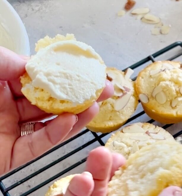 Mix the ricotta cream together. Slice each muffin in half and fill with cream.
