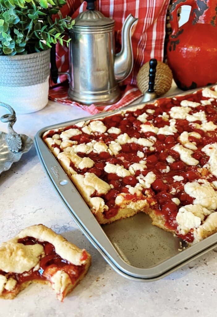 Cherry Pie Bars are a twist on my grandma’s award-winning Cherry Pie. The recipe takes some shortcuts, so it is fast and easy to make, while still getting all those cherry pie flavors. IF you are scared of making an actual pie, then this would be a non-stressful one to try.