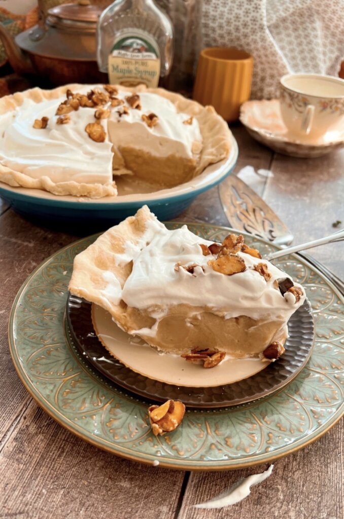 A few years ago, mom developed this recipe and brought it to Thanksgiving. Maple Cream Pie with Sugared Almonds is now one of my TOP Favorite pies AND I do NOT even like Maple!!! What is up with that? That is how good this is! It will convince non maple lovers to like maple, after a lifetime of hating it.