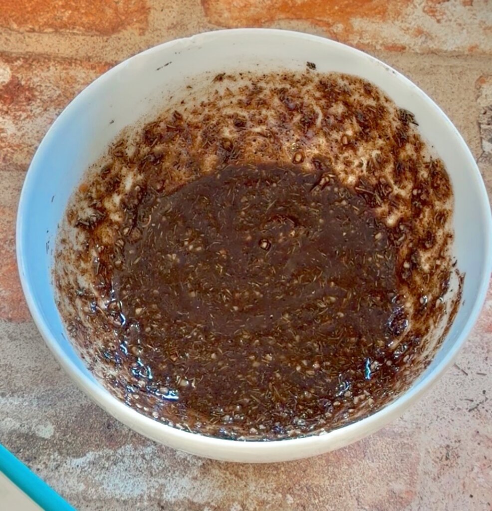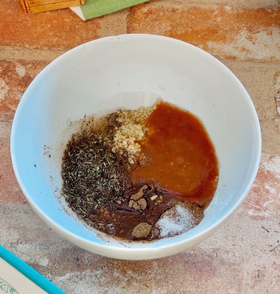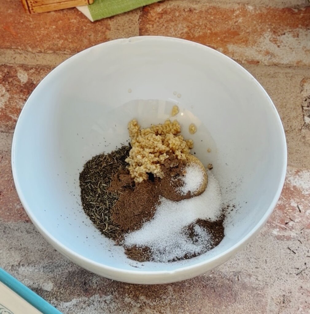 Mix together a marinade of thyme, brown sugar, garlic, allspice and apple cider vinegar.
