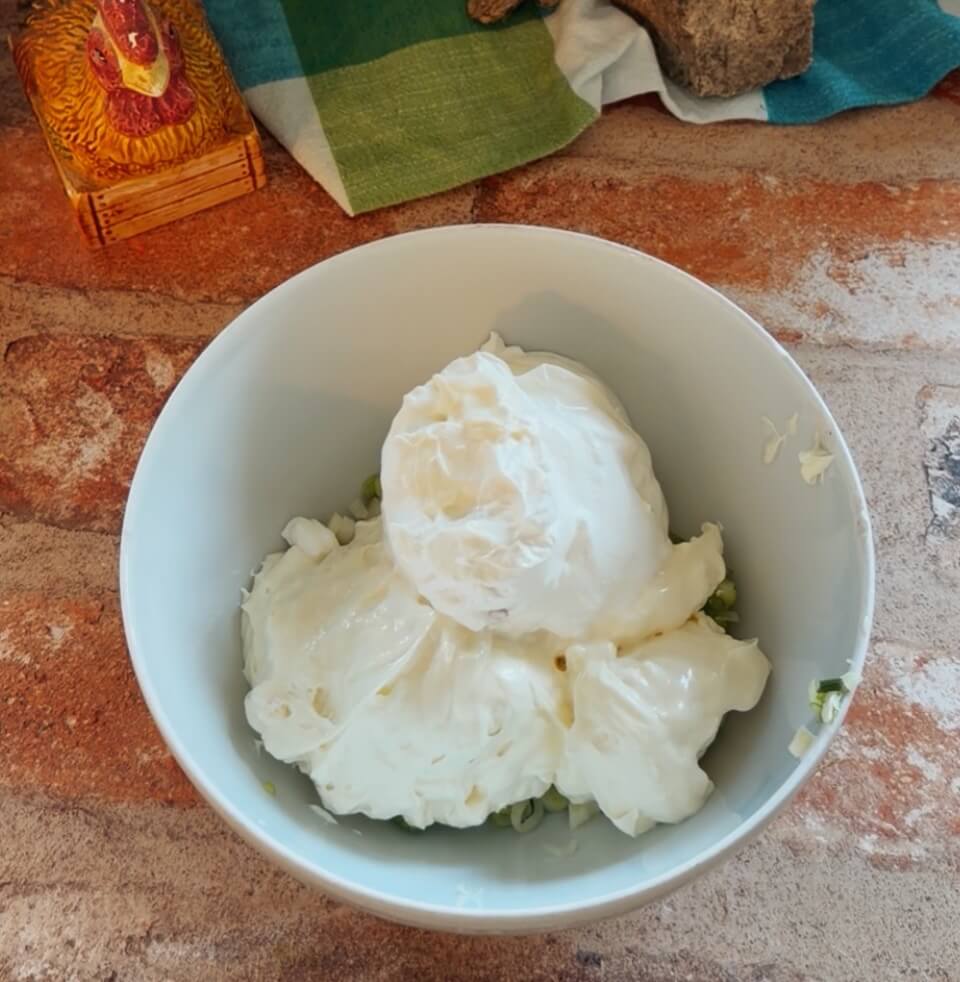 Mix the green onions, mayo, sour cream and a little hot sauce.