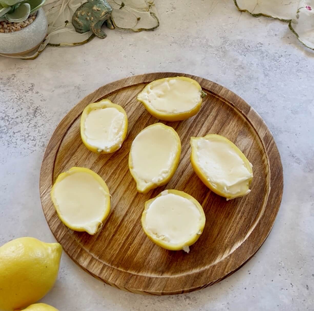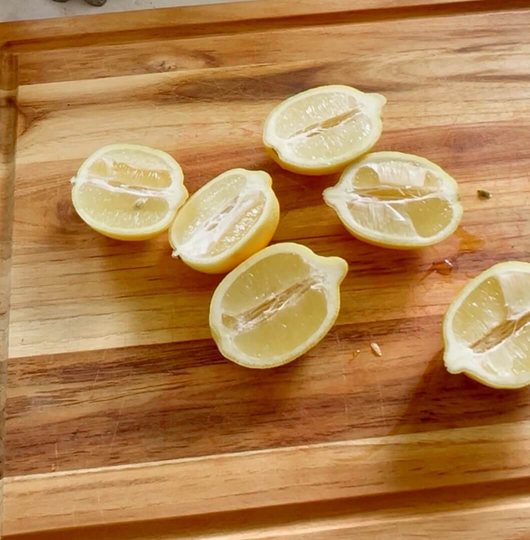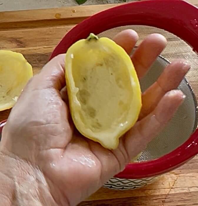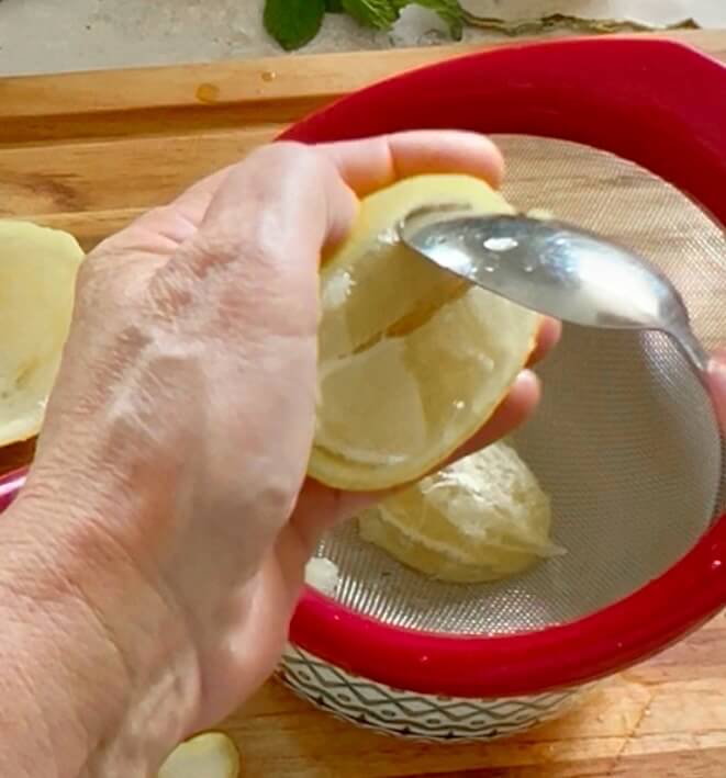 If you are using fresh lemons, cut in half lengthwise and use a sharp knife to go around the edges to make it easier to scoop out.