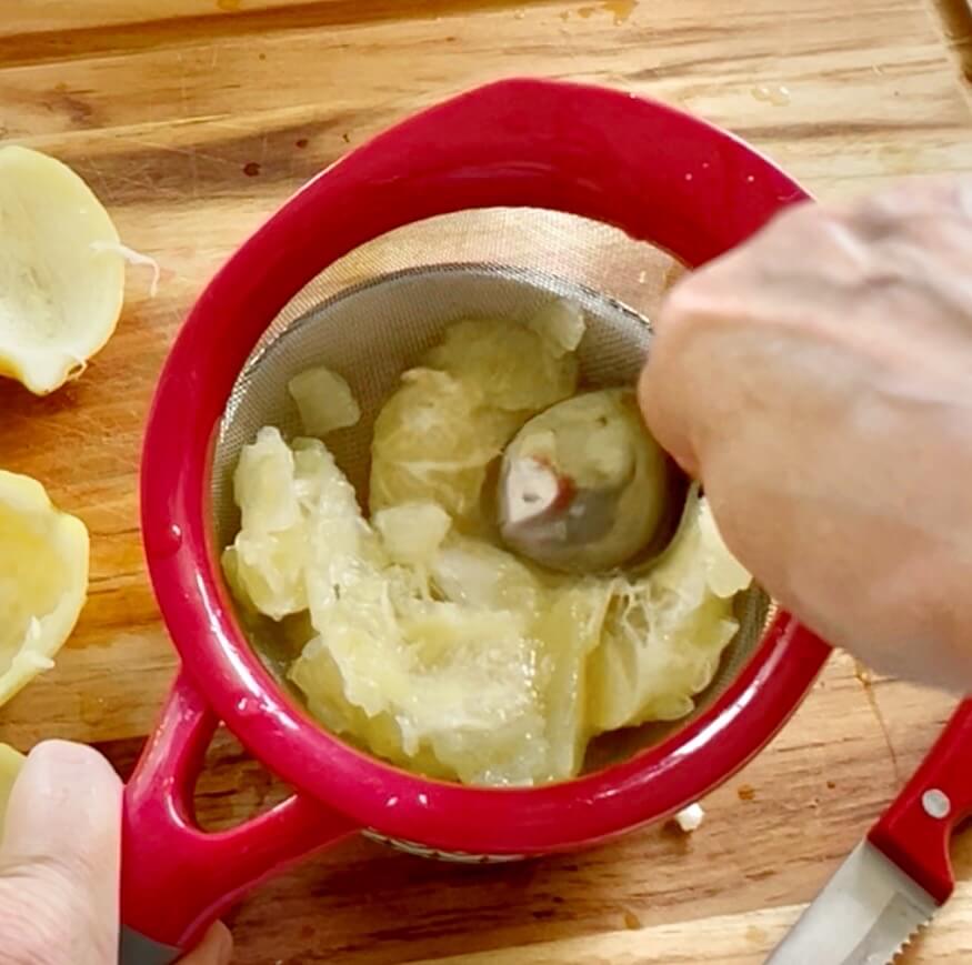 - Slice lemons in half lengthwise. Use a knife to cut around the edges of the pulp and use a spoon to scoop it out of the rind. Place pulp in a strainer and use a spoon or your hand to the squeeze lemon juice into a bowl.**Or use bottled lemon juice.