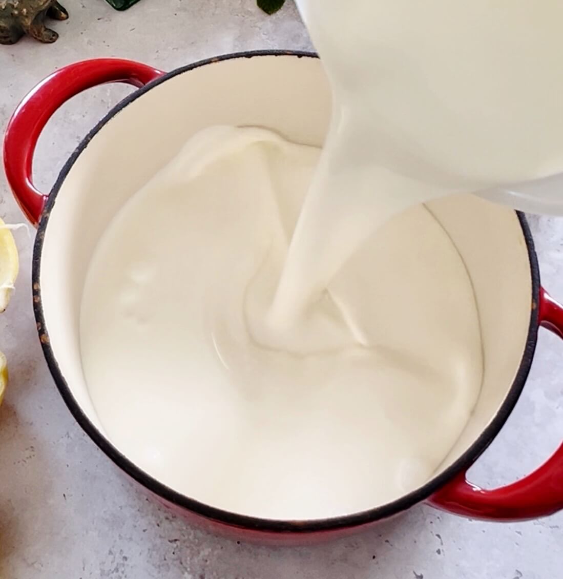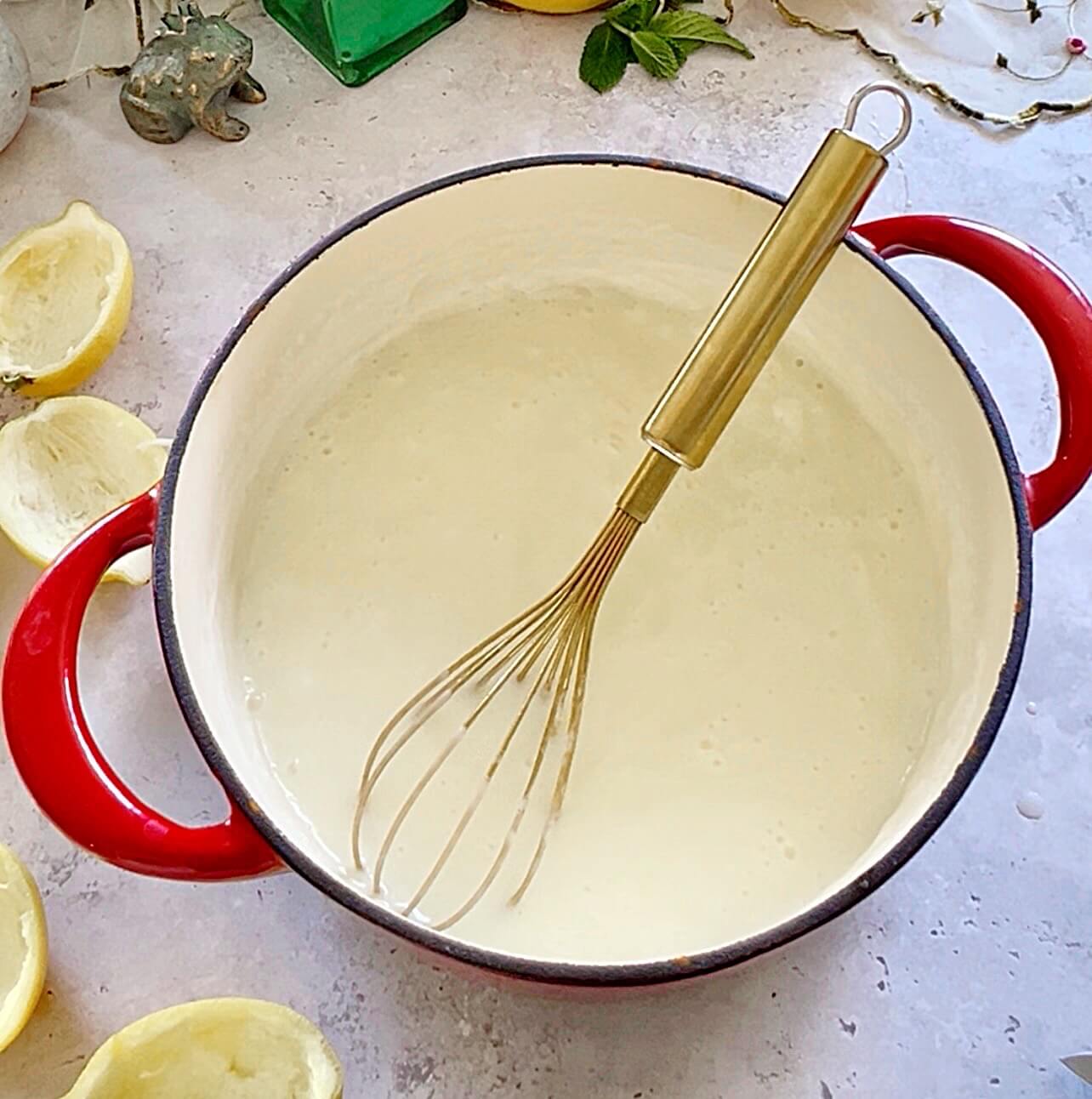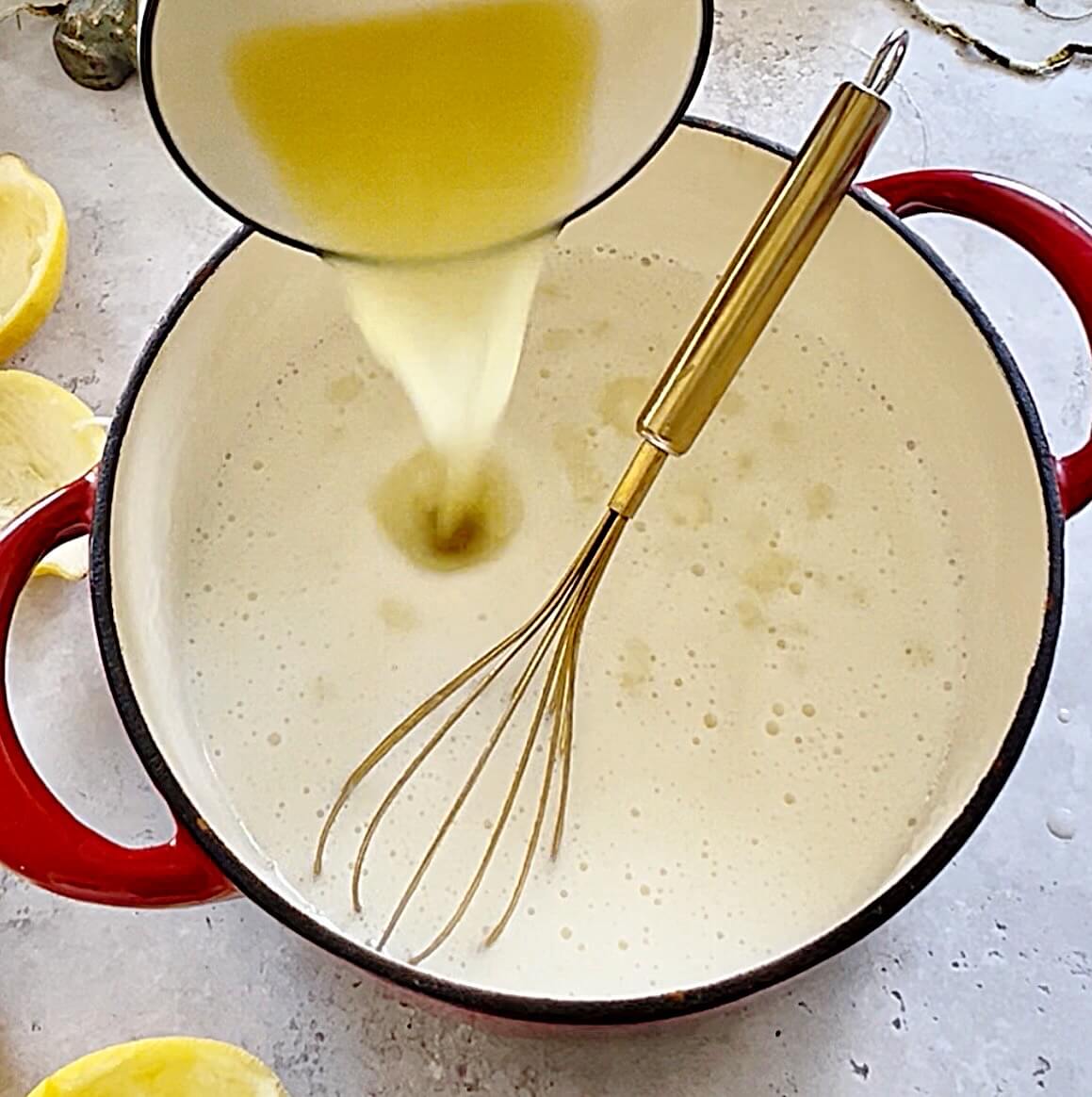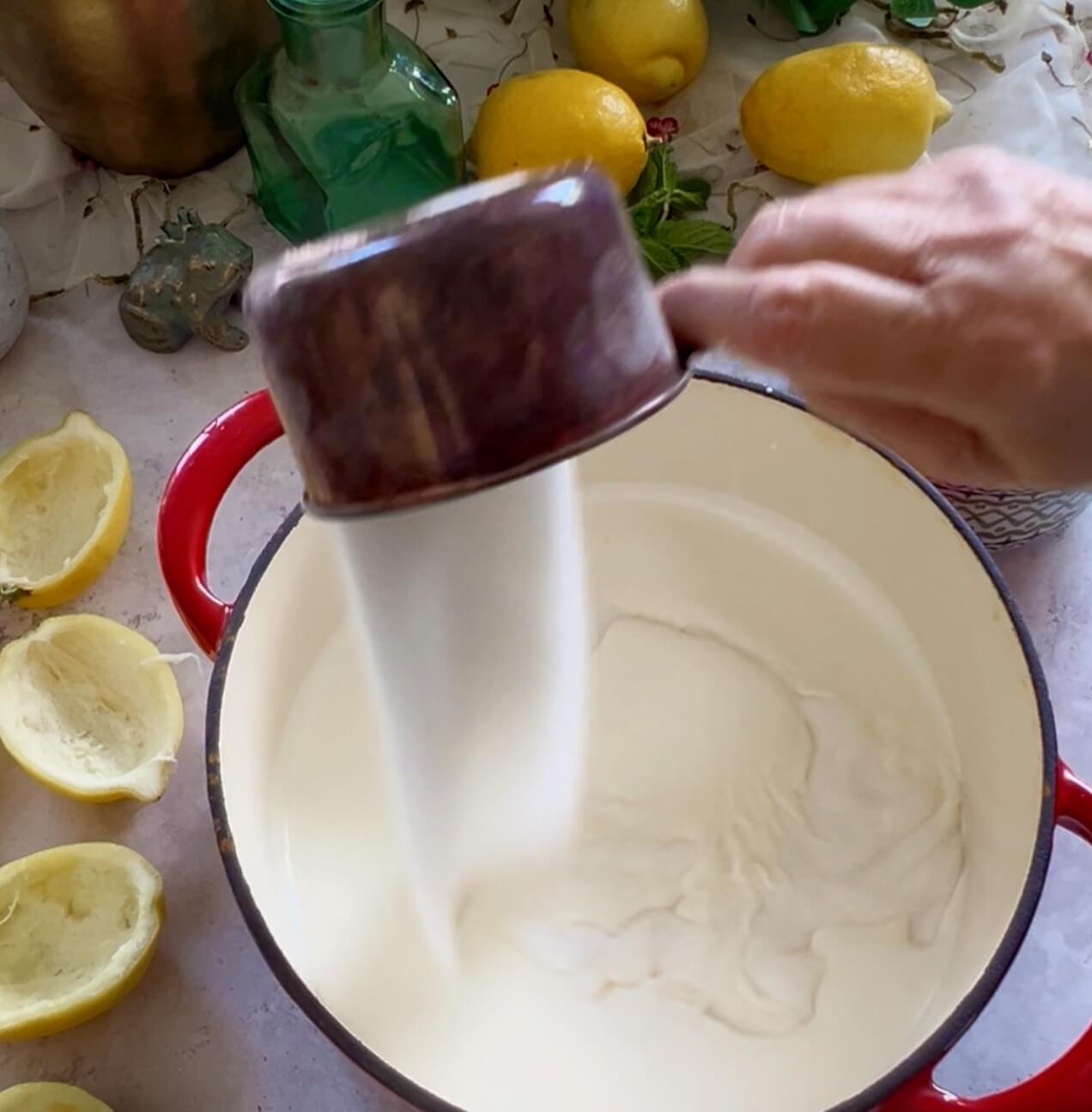 Pour in the lemon juice and vanilla and whisk as it thickens until smooth.