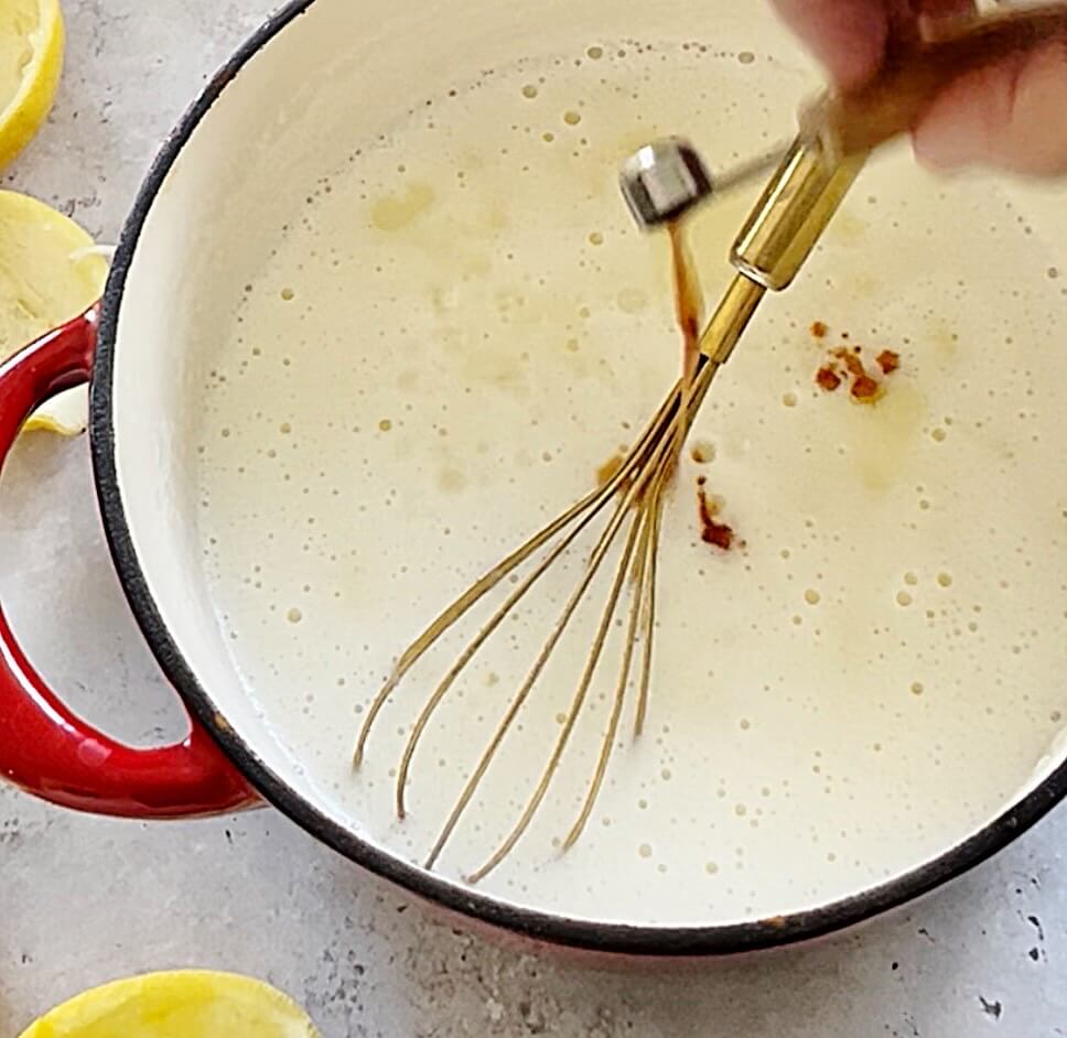 - Remove from heat and stir in lemon juice and vanilla. Whisk until well mixed.