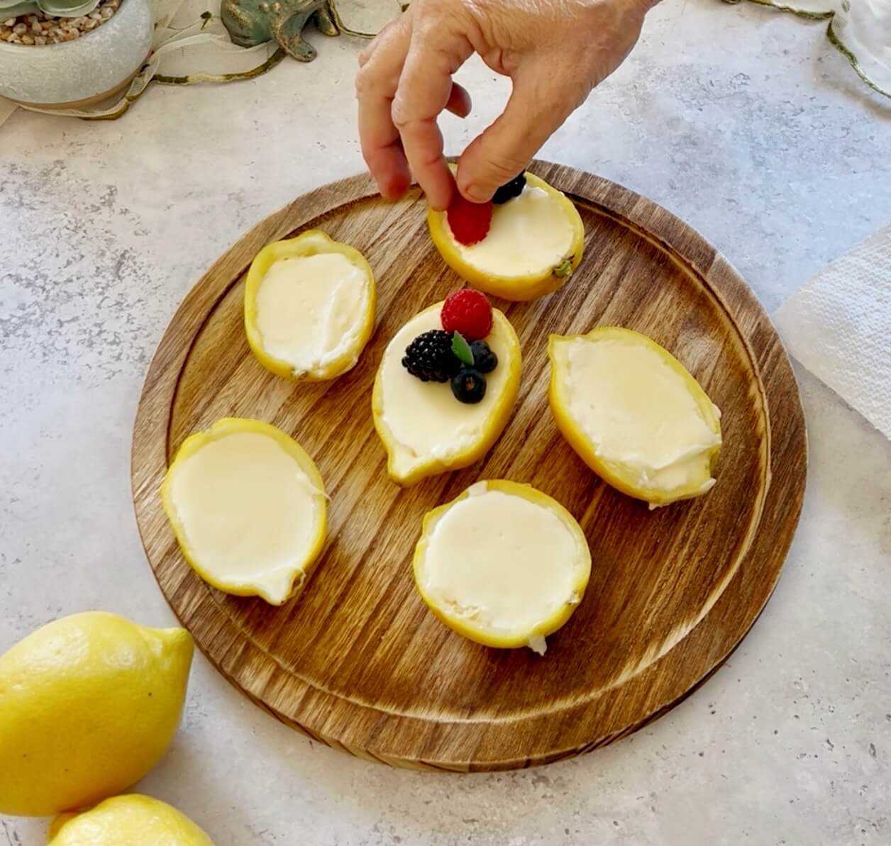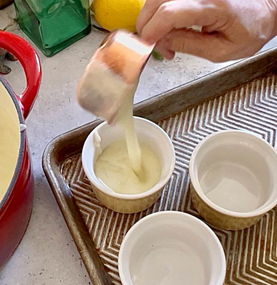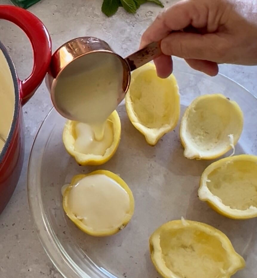 NOTE: You will only need the juice from about 3 lemons for the recipe but will probably need double the amount of lemons to fill. I usually fill the lemon halves and pour the remainder into ramekins.