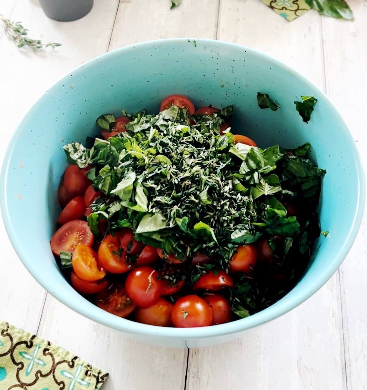 - Wash tomatoes and cut into bite-size pieces...either in half or quarters.