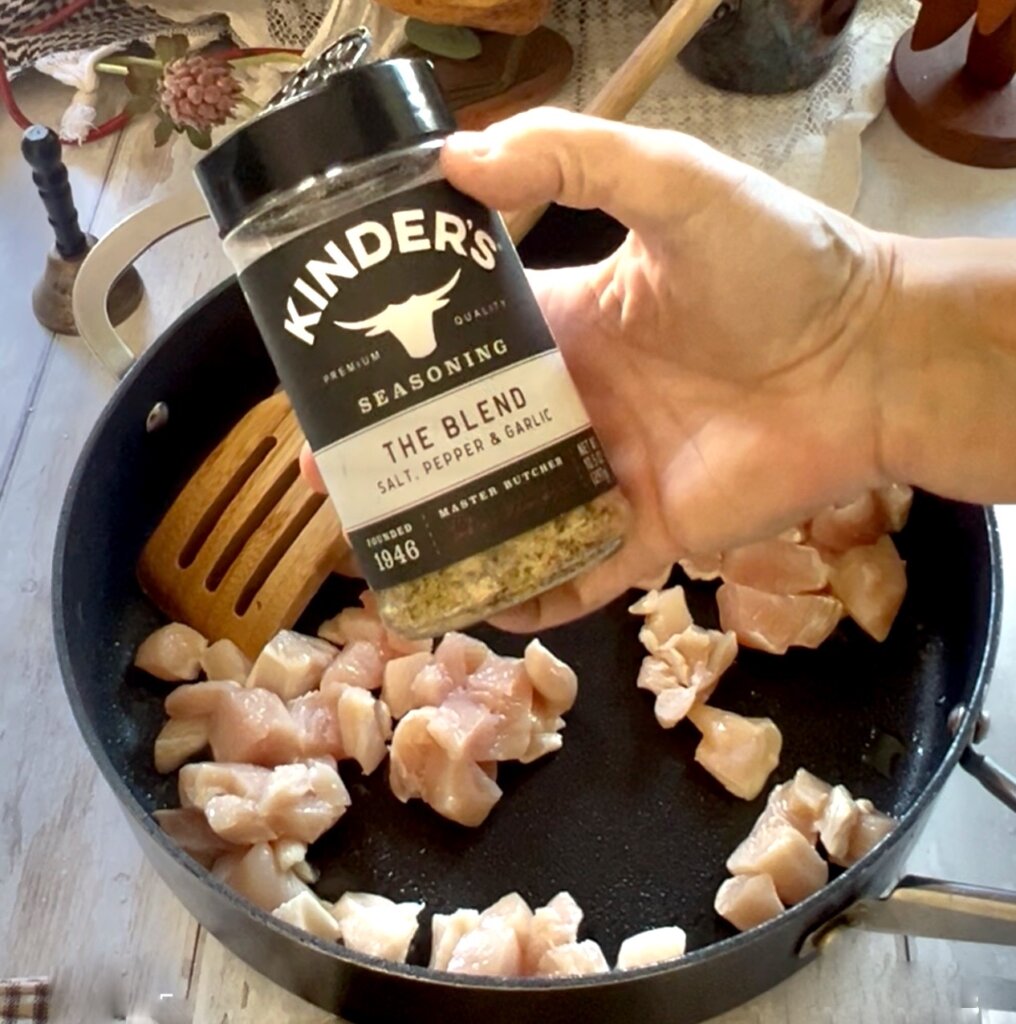 - Trim and cut chicken breast into bite-sized pieces. Season with garlic salt.