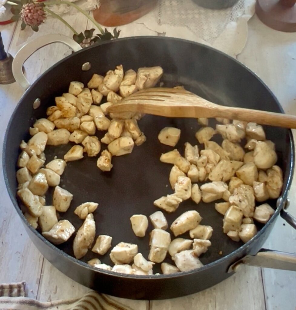 - Brown the chicken in the hot oil at med/hi until pink is gone. Remove into a bowl and set aside.