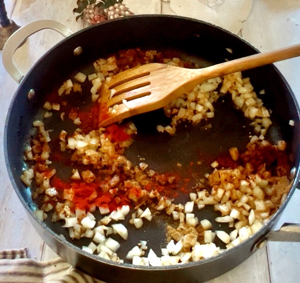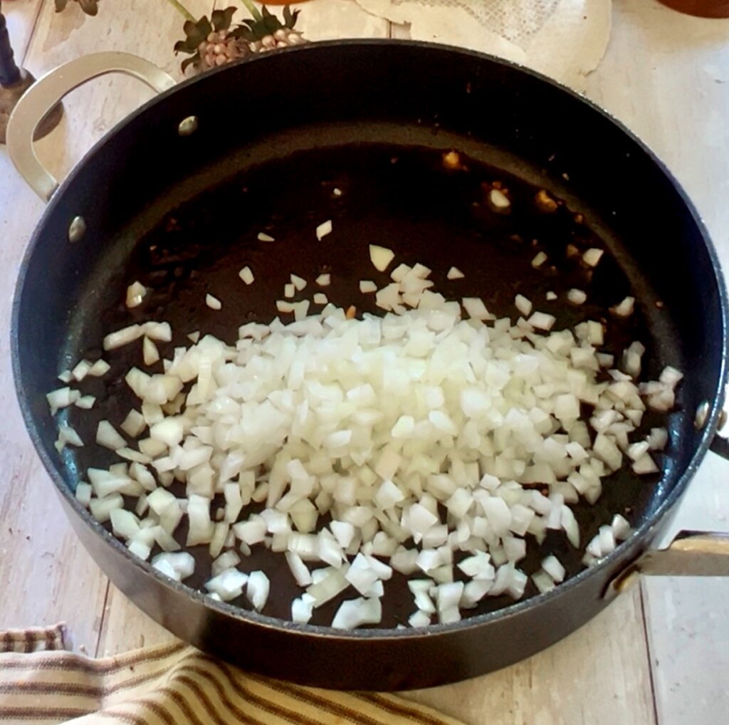 - In the same skillet heat another Tbsp of olive oil. Sauté onion over med/hi heat until softened. Add the garlic and cook & stir for another minute.