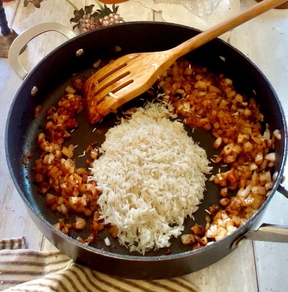 - Add remaining spices and the rice. Cook and stir for 2 more minutes.