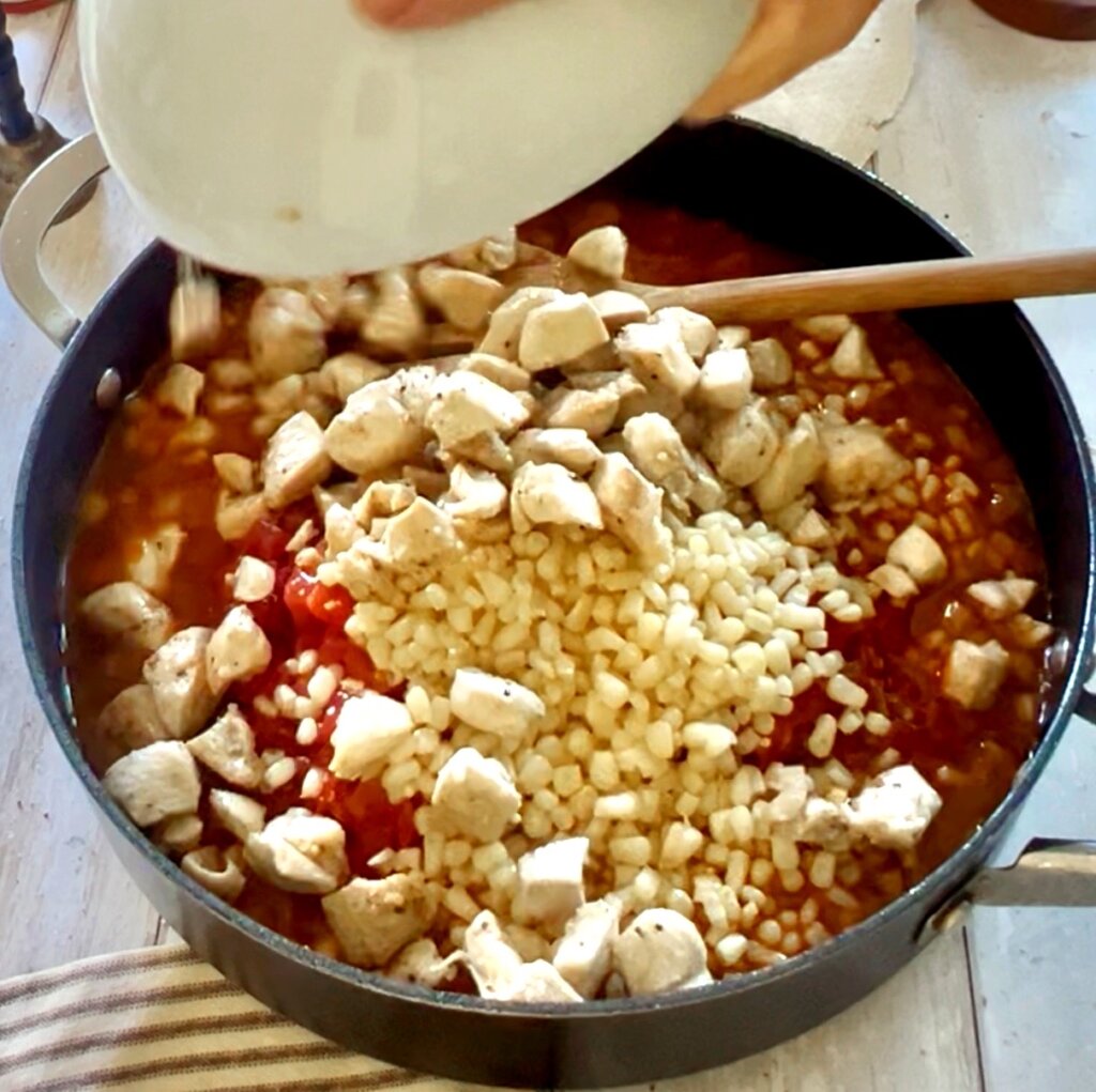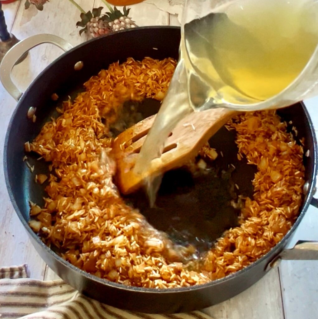 Remove the chicken and sauté the onions and garlic. Add in the seasonings and rice and let the spices bind with the rice.