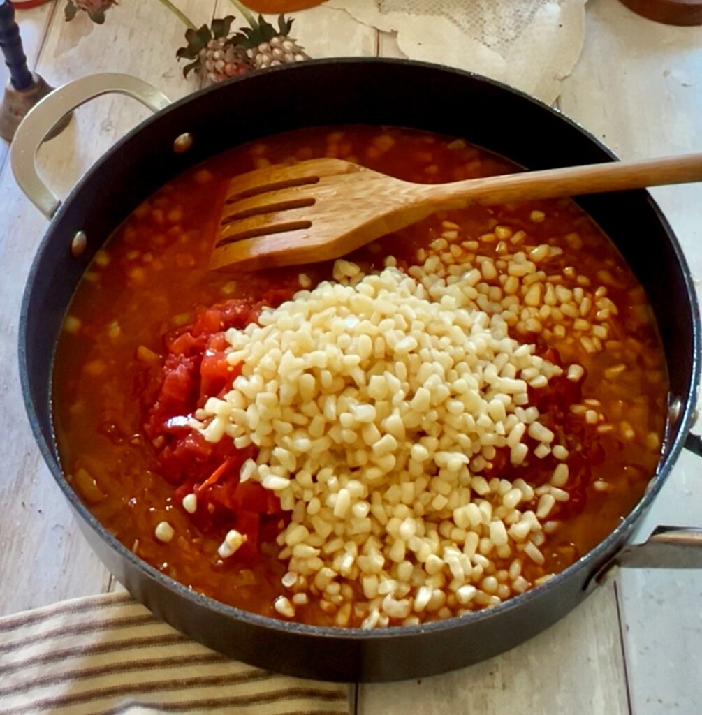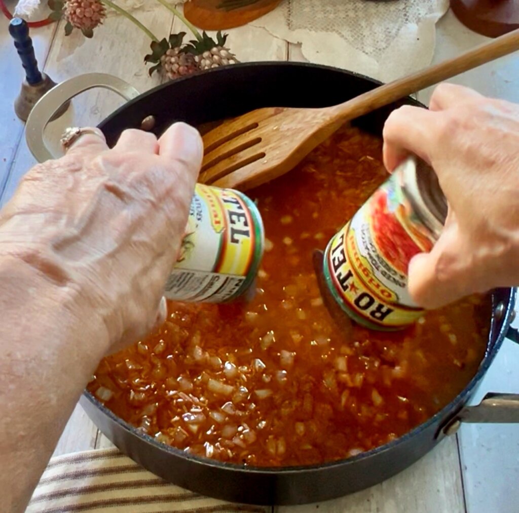 Add the chicken broth and water, Rotel tomatoes and corn.