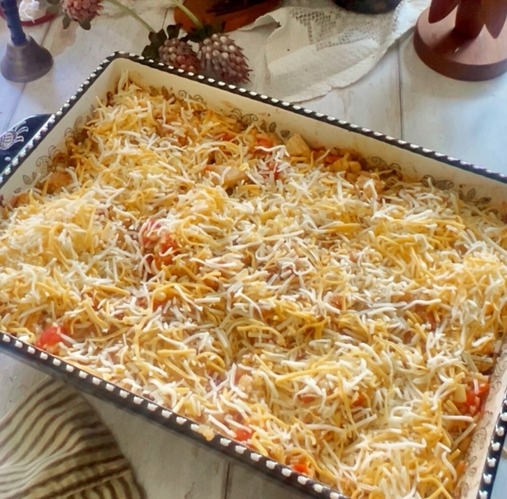 Bake covered until rice is cooked and stir it all up. Top with cheese and bake until the cheese is melted.