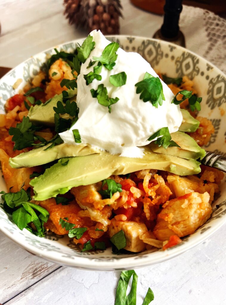 - Dish up and top with cilantro, sliced avocado and sour cream. Serve with tortilla chips if desired.