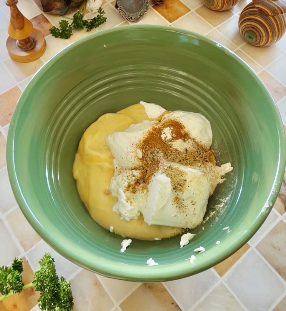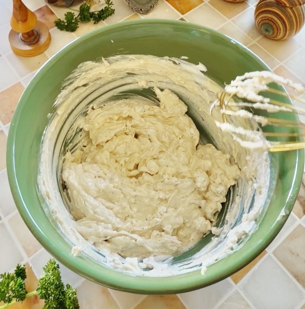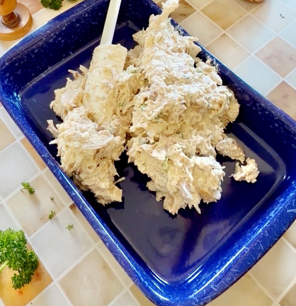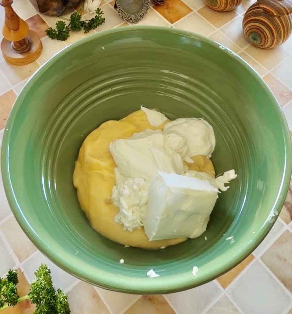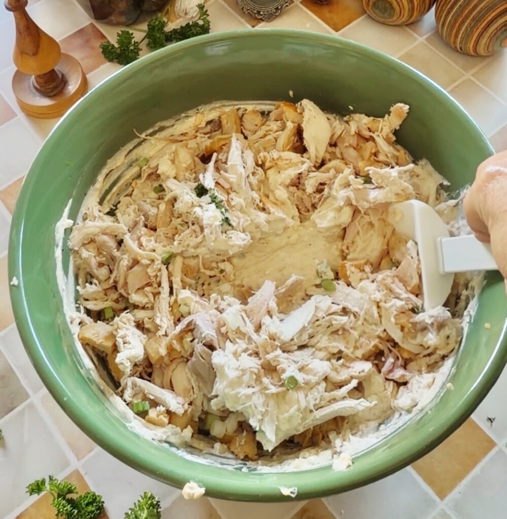 - Mix together the cream of chicken soup, cottage cheese, sour cream, cream cheese and seasonings. *There may be small lumps of cream cheese which is fine.